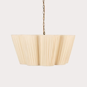 this is a pendant that is wavy with pleated fabric and the underside has a circular piece of fabric as a cover