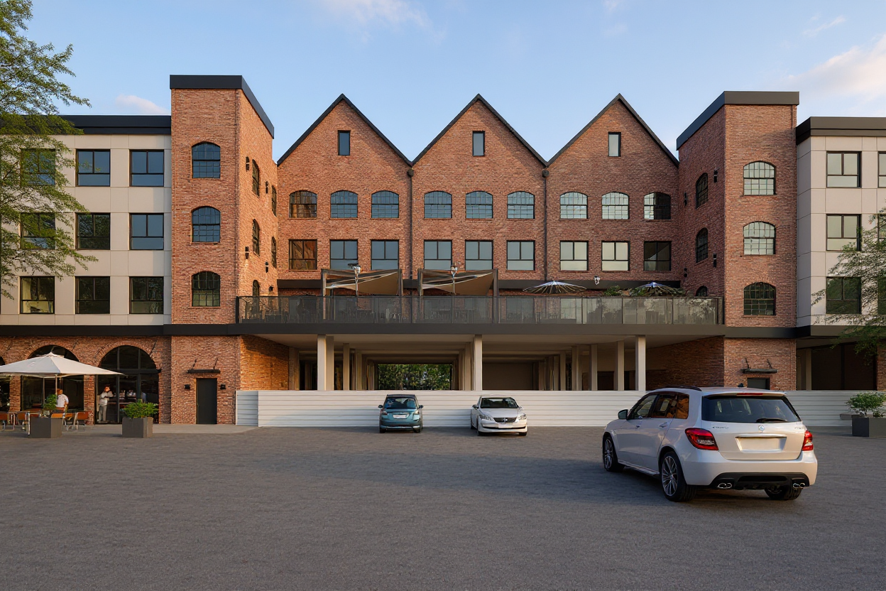 create a photo realistic image of this entertaining living area as it is open to a covered lanai use materials that are off white paint shell tile pale gray color cabinets polished nickel hardware tan and white quartz slab