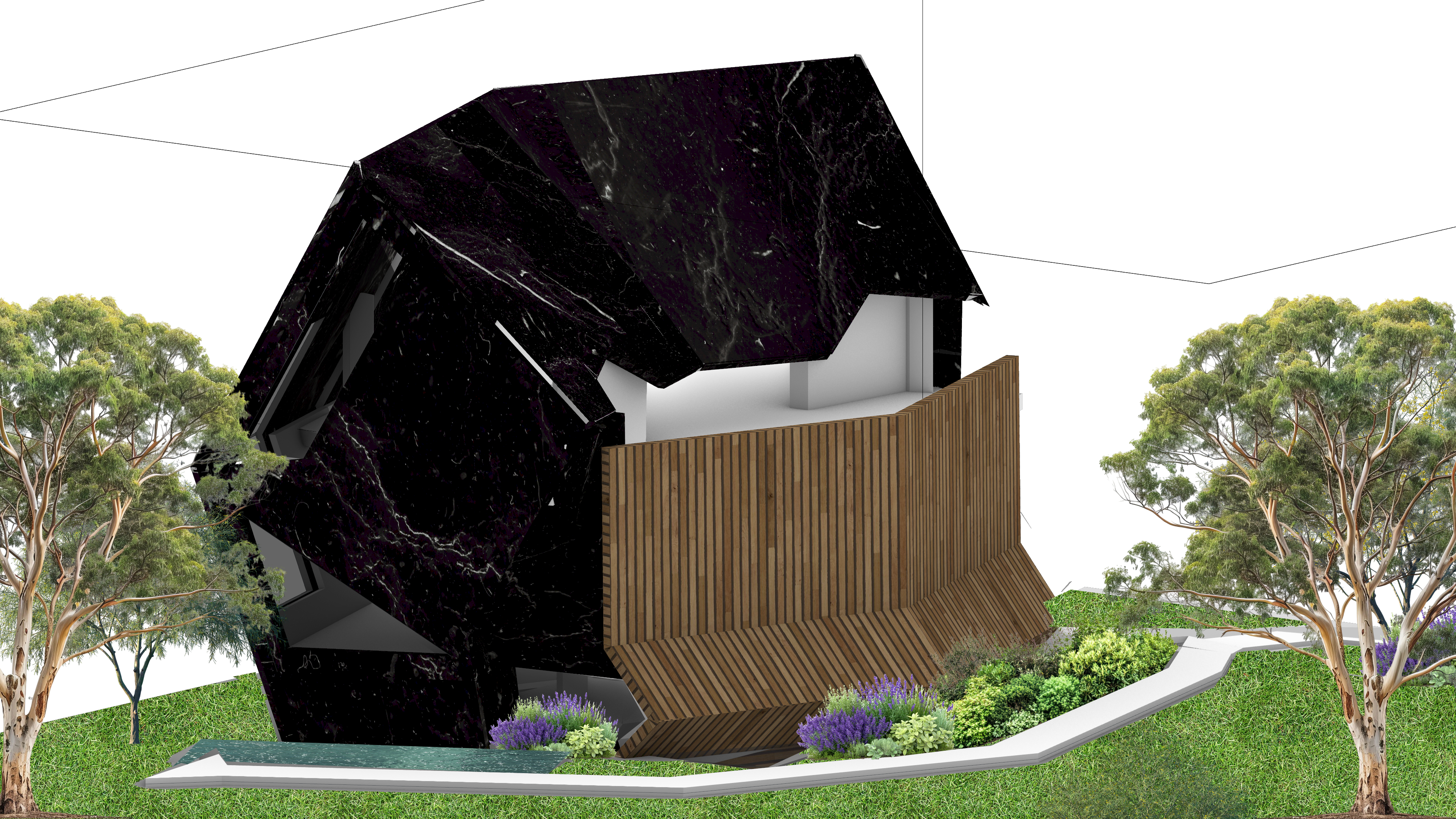 exterior shot apply soft daylight with slight haze desaturated earthy tones and a cinematic mood emphasize minimalist composition muted colors and flat entourage silhouettes that blend graphically into the scene reduce hyper real reflections and glossiness adding subtle film grain for a photographic feel final image should feel like a conceptual architectural visualization calm atmospheric and editorial m