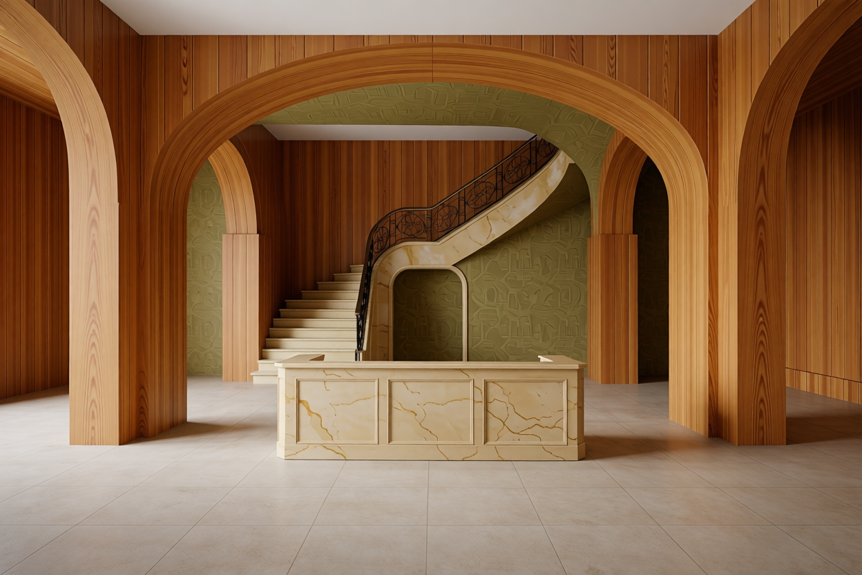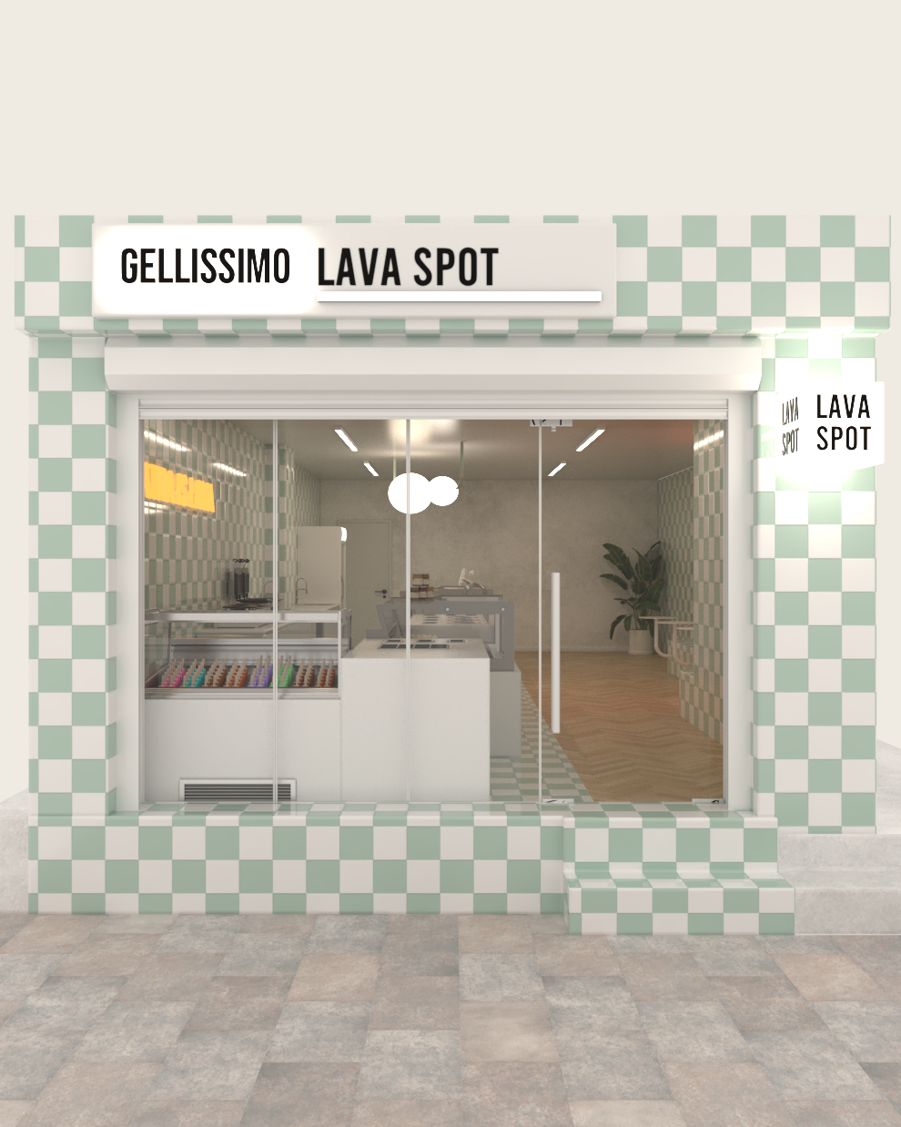 render this scene in high quality photorealistic style using the exact same camera angle framing and perspective as the reference image do not change move remove or add any objects keep the storefront design furniture layout and signage exactly the same improve realism by enhancing material textures and details add richer surface texture and micro details to all materials tiles plaster corian wood metal the exterior green white checkerboard tiles must feel more realistic with subtle imperfections grout definition and glossy reflections the interior surfaces should have realistic roughness variation and soft reflections not flat exterior environment upgrades add a clean morning sky clear weather soft daylight add a subtle urban reflection on the glass facade city surroundings reflected softly not too strong still allowing the interior to be visible continue the building upwards above the storefront create additional upper floors in white facade no checkerboard material continuing above add as much realistic architectural detail as you want windows frames balconies subtle shadows clean modern look overall look make the space feel alive and vibrant bright but realistic with natural light soft shadows global illumination and high detail professional architectural visualization ultra realistic sharp textures 4k quality