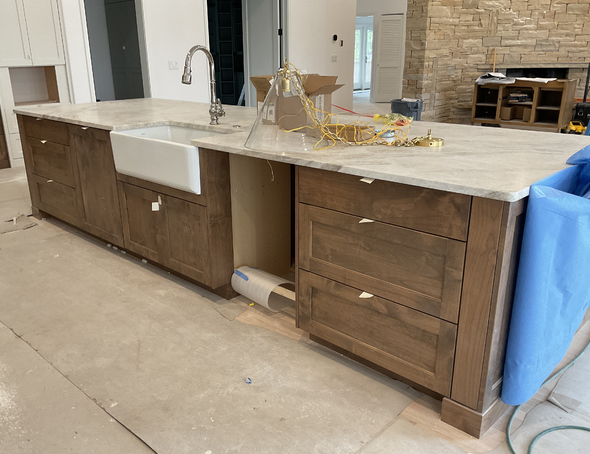 do not change the cabinets in any way preserve the exact cabinet colors materials finishes dimensions door and drawer styles hardware spacing alignment and all geometry exactly as shown do not alter the countertop shape backsplash appliances flooring lighting fixtures or wall structure only remove the construction materials clutter and mess from the scene clean the room and make it look finished and staged add a few simple tasteful home accessories appropriate for the style of the space but do not add or remove any furniture windows or architectural elements maintain the original lighting direction and realism enhance clarity and polish the photo while keeping the cabinetry and room design completely unchanged do not alter the lighting to keep the cabinet colors as they are in the image add light wood flooring put a dishwasher to the right of the sink add chrome cabinet pulls to the door and drawer fronts stage the countertop for a simple entertaining party blur out the background