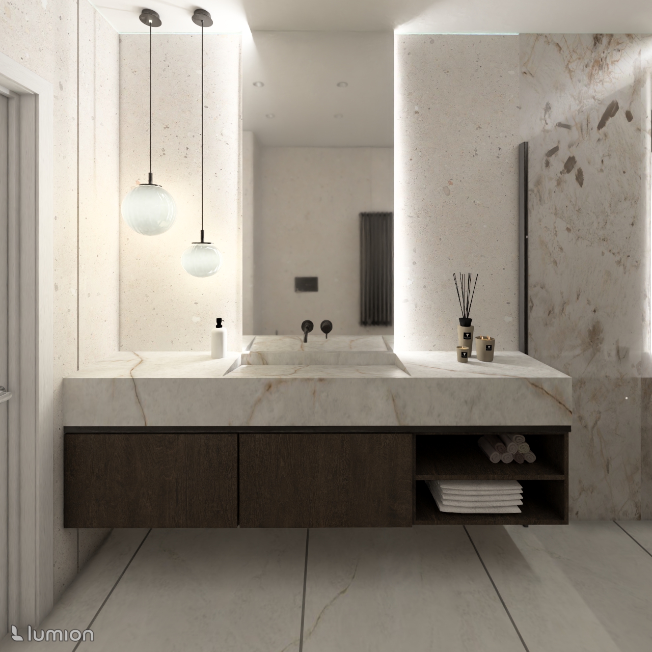 ultra photorealistic architectural interior photo enhance realism while preserving the exact composition layout camera angle materials and objects modern marble bathroom with walk in glass shower beige and cream marble walls with warm golden veins minimal stone sink counter matte black shower fixtures frameless glass shower panel soft warm sunlight entering the room delicate natural warm beige color palette creamy whites and soft golden tones similar to luxury architectural photography slightly sunlit marble surfaces gentle highlights and soft shadows elegant natural color harmony lightly desaturated tones realistic marble texture detail physically accurate reflections on glass and metal global illumination cinematic architectural photography lighting calm spa atmosphere hdr lighting ultra detailed remove watermark remove text from bottom left corner no change in design layout furniture or materials