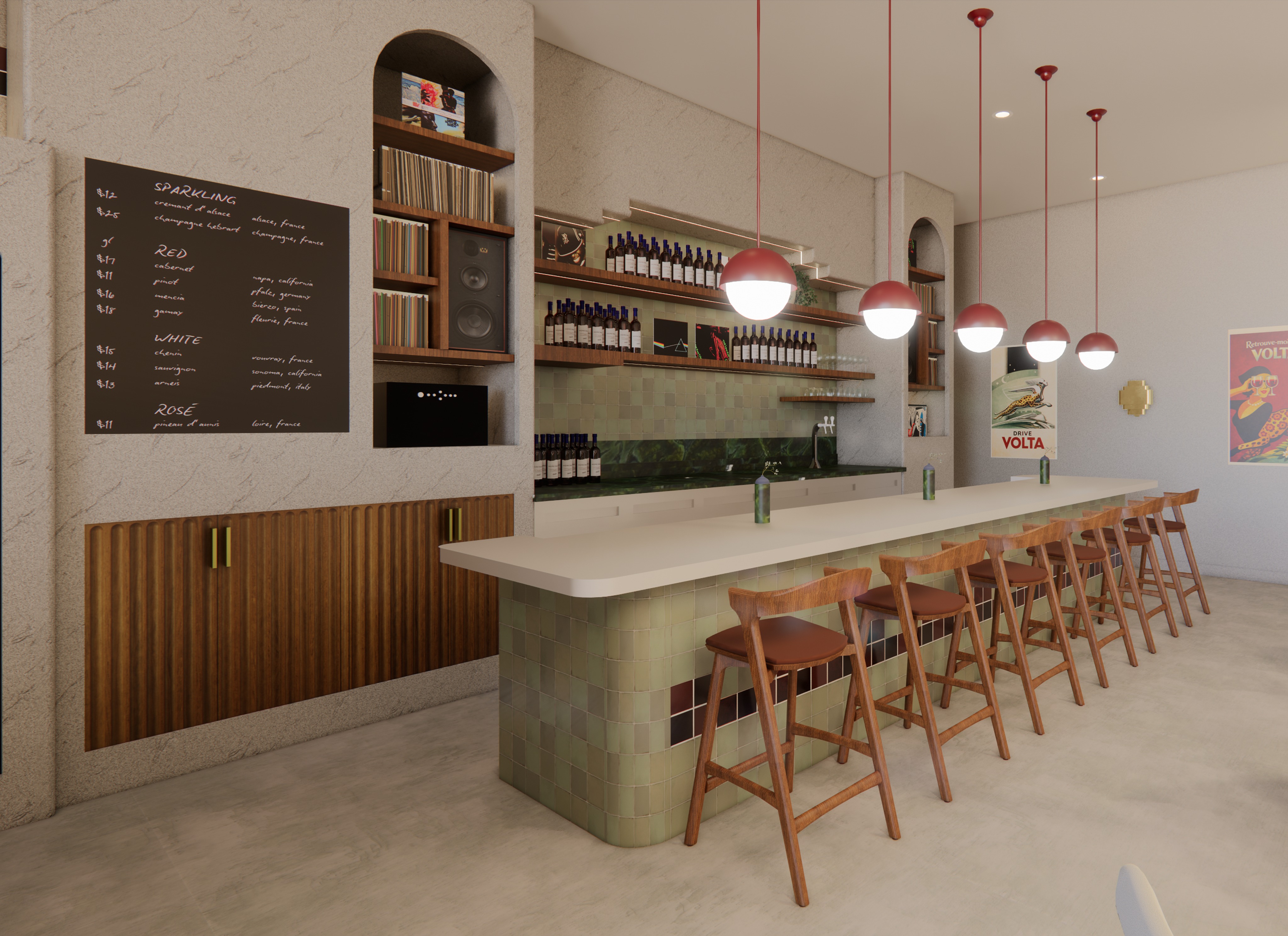 maintain everything the same maintain all geometry colors furniture placement lighting camera angle and textures add upside down hanging wine glasses under the first shelf behind the bar hang the glasses directly over the wine bottles sitting on the counter on the left side of the bar on the left side of the bar add a vintage vinyl record player with two turntables and a mixer that is elegantly inset flush into the bar counter it does not sit on top of it on the left side of the bar on the bottom shelf of the archway replace the black box with a vintage mcintosh tube amp