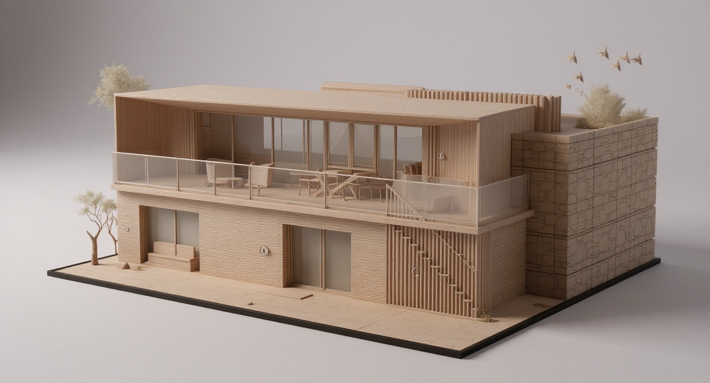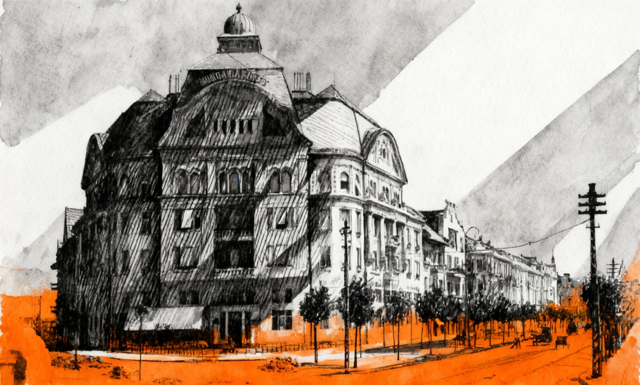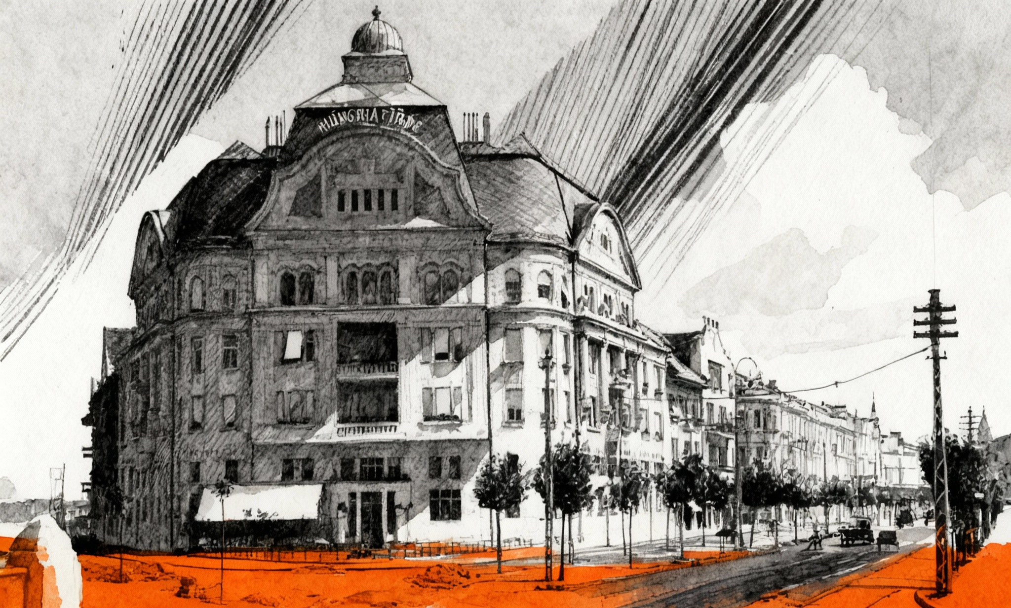 ultra realistic architectural photomontage integrate the proposed new building use the provided 3d massing as geometry reference into the real photograph of strada mihail kog lniceanu constan a between the two buildings marked by vertical red lines keep the alignment of the first floor cornice perfectly matched with the neighboring historical building on the right height regime basement ground floor 2 floors recessed terrace level staircase block visible on top design the fa ade as a contemporary interpretation of the historic context warm light beige or off white plaster vertical rhythm aligned with the adjacent fa ades elegant window proportions thin metal frames bronze or dark neutral subtle horizontal parapets no excessive glass surfaces ground floor must read as a commercial function with larger transparent openings but refined not a glass curtain wall blend the new fa ade naturally with the street match real perspective lighting shadows color temperature texture roughness and weathering preserve all existing context buildings unchanged keep sidewalks street vegetation and cars realistic camera style street level photo 24 35mm lens lighting soft daylight slightly overcast natural shadows visual mood calm contextual premium contemporary architecture integrated into a historic european street