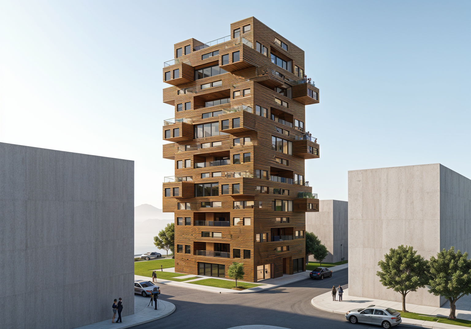 this is the walkout backyard of a home in a housing development in winnipeg manitoba there will be houses across the street in the background and on either side of the building about 10 feet away form the building some tasteful restrained landscaping with low flowers and shrubs and bushes add some outdoor furniture to the covered deck
