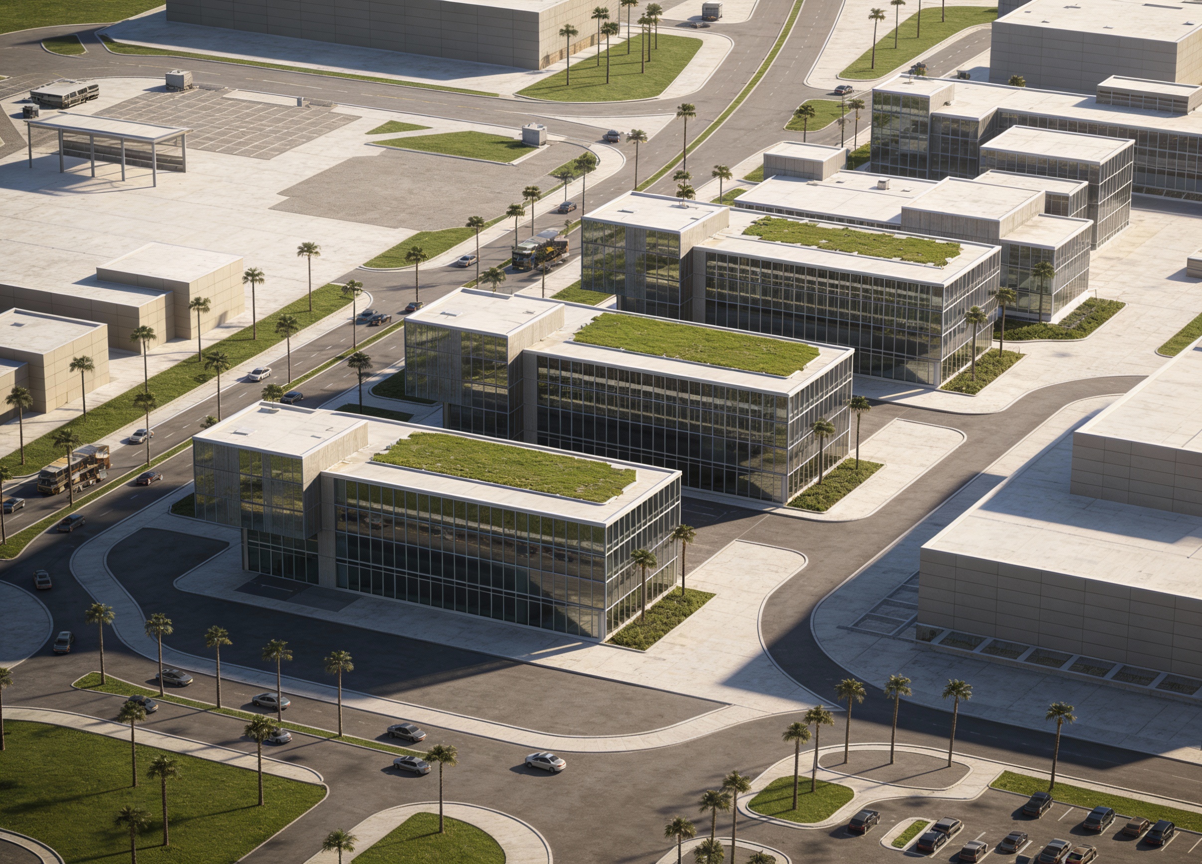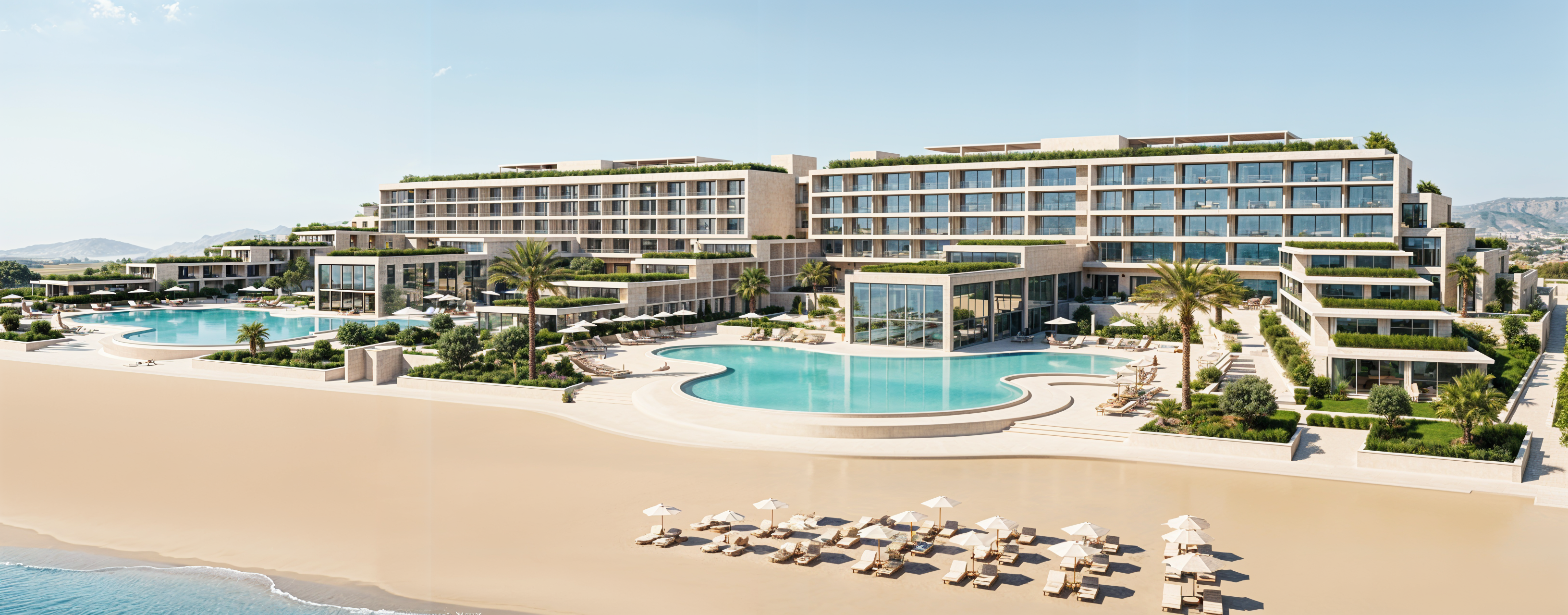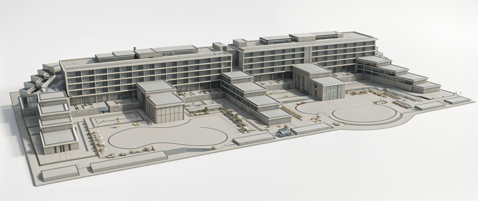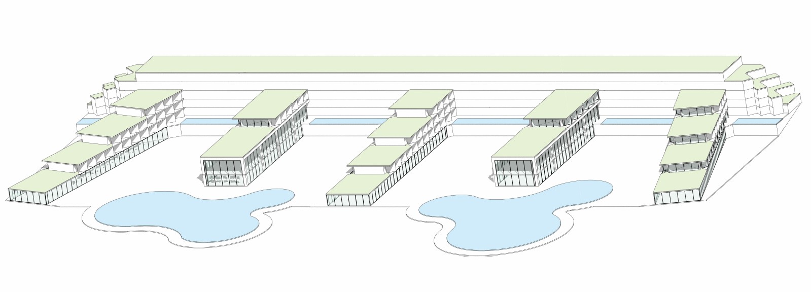 exterior shot convert this architectural render into a precise 3d model visualization preserve the exact geometry spacing and stepped topography keep all buildings terraces pools and paths in their original positions and proportions remove all colors textures glass reflections shadows and environment apply a single neutral clay or light gray material to all surfaces pools should be simple flat shapes without water reflections sharp edges accurate forms no artistic interpretation soft studio lighting white or light gray background focus on architectural structure massing and spatial clarity