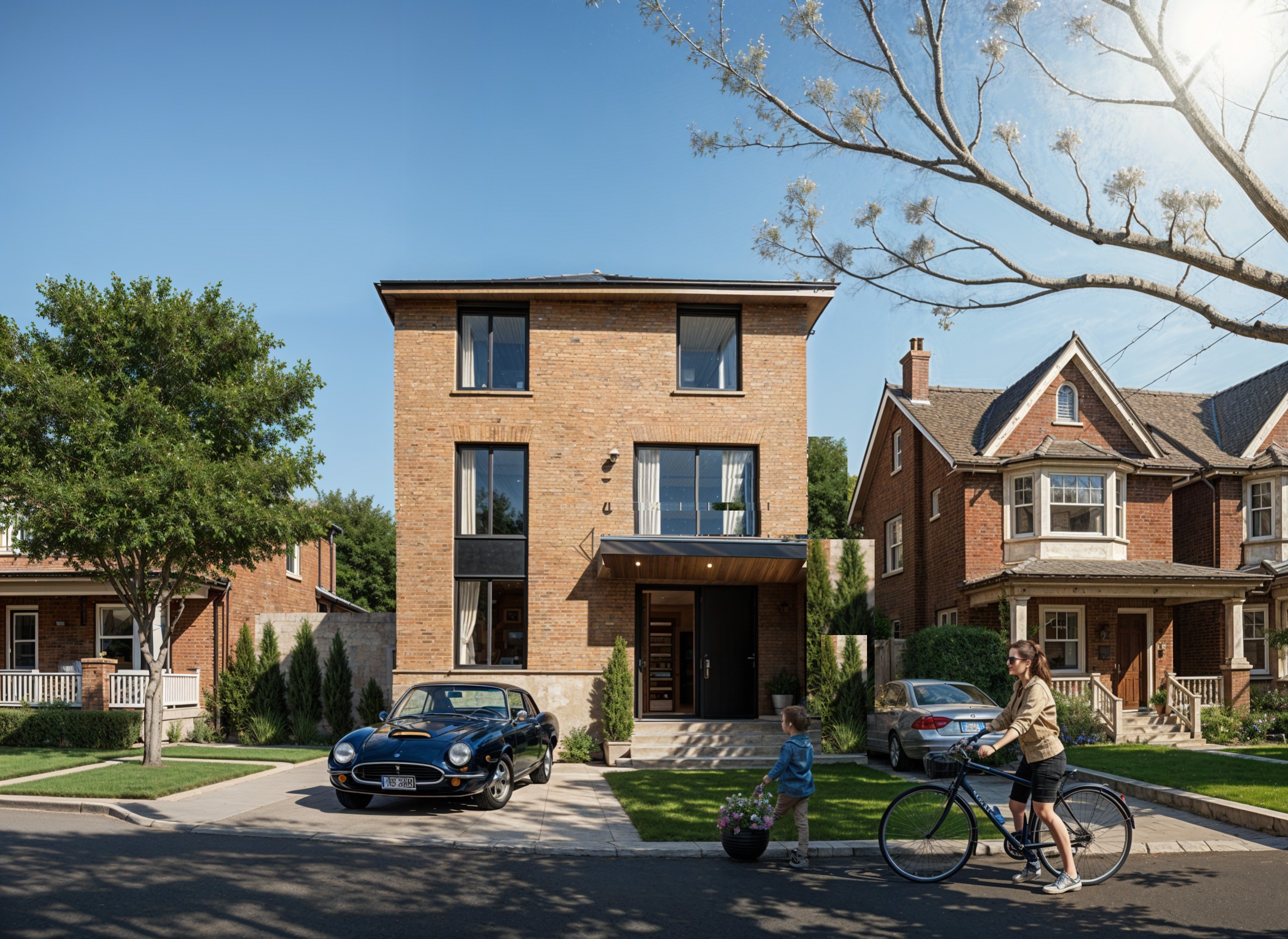 sleek black canopy with no railings above over the main entry and soft morning diffused light