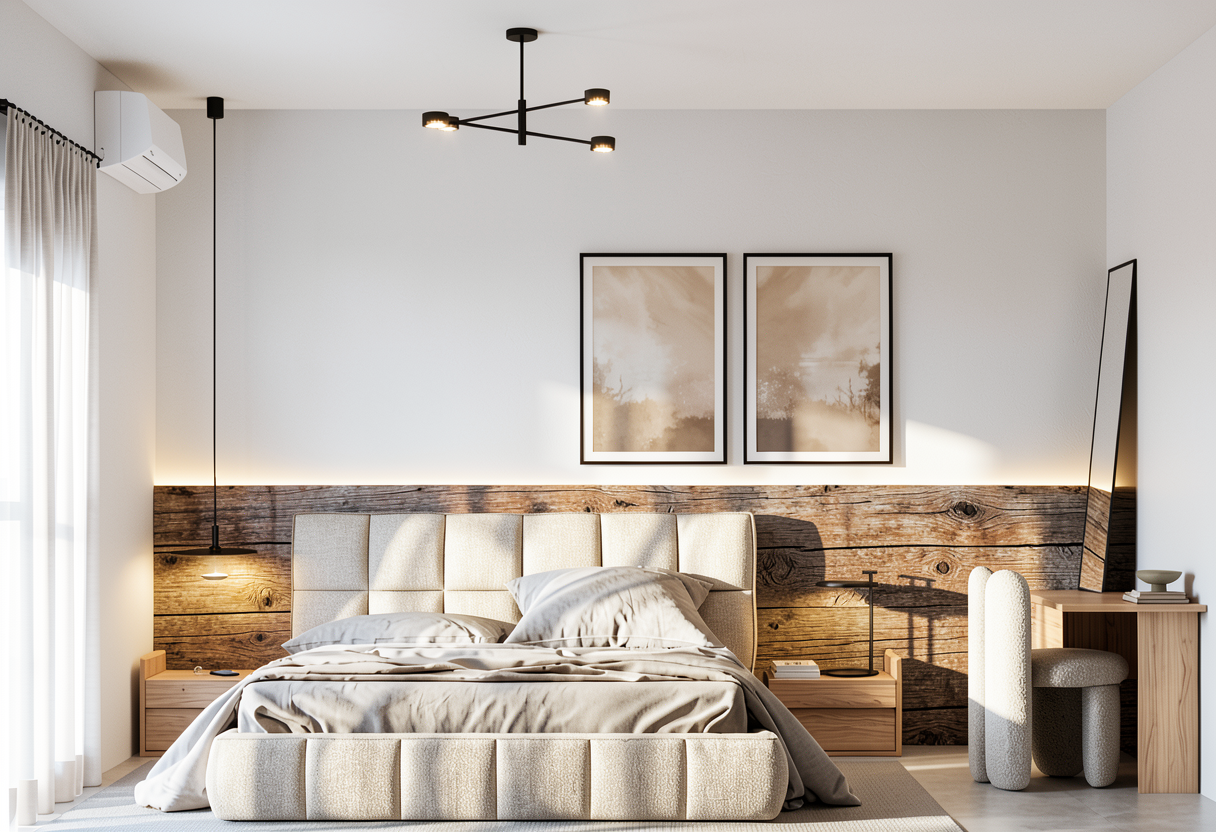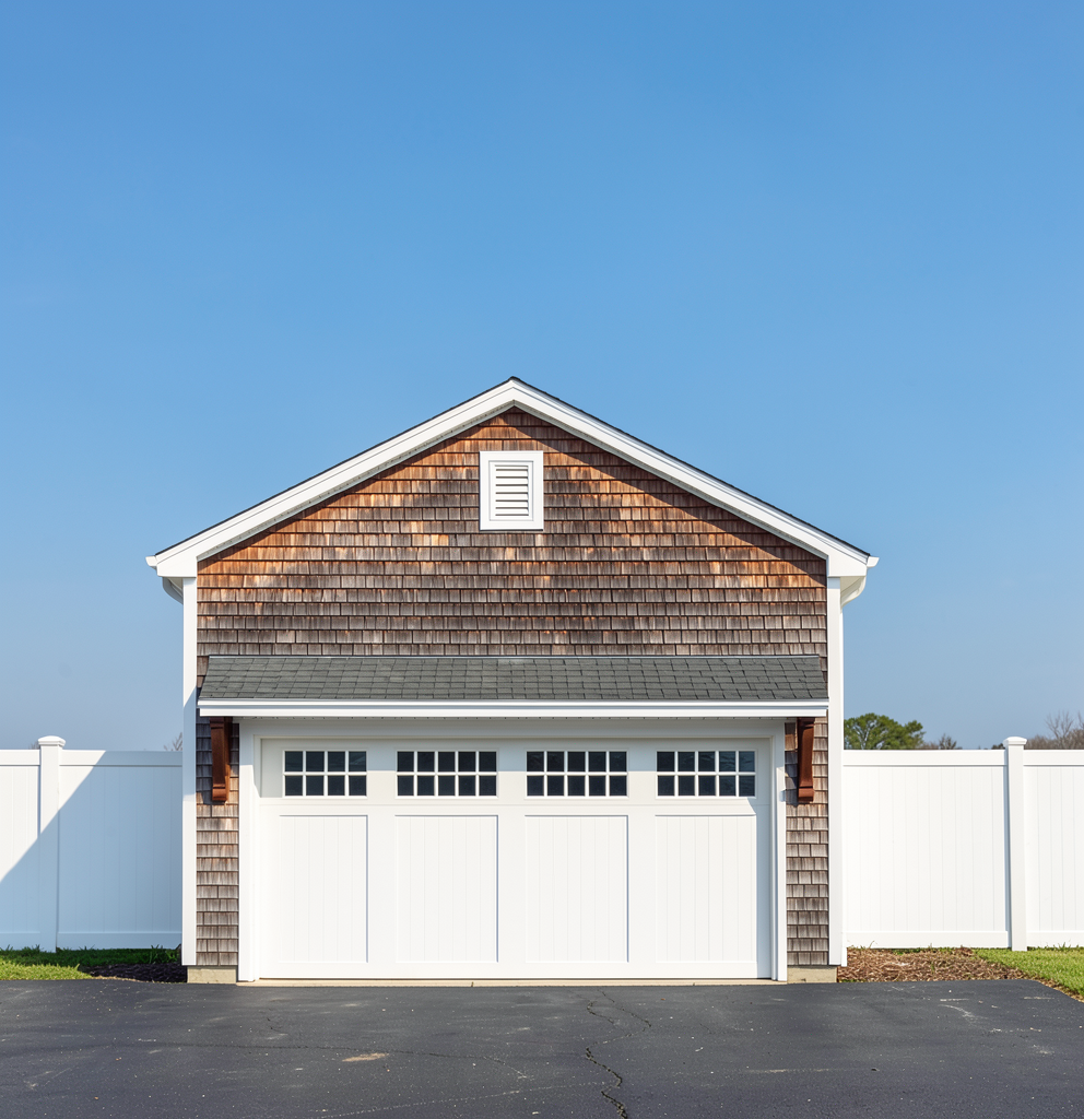 weathered cedar shingle siding white trim brown brackets dark grey roofing blue sky 6 foot white fence in background new asphalt driveway width of door no houses in background