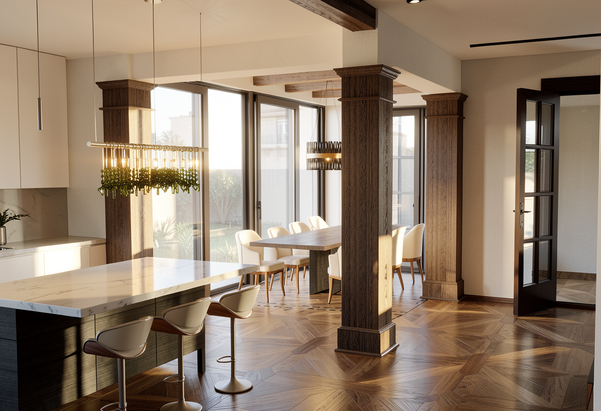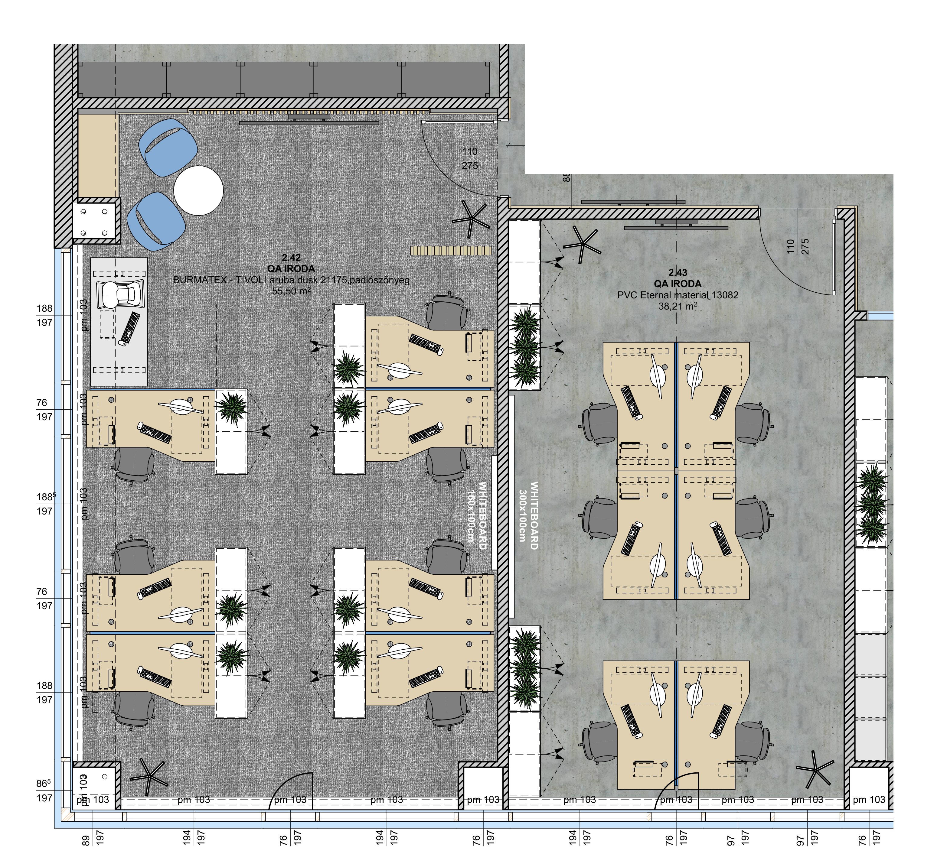 photorealistic 3d top down perspective floor plan render of a modern office structure layout two distinct office zones a larger office on the left and a smaller office on the right structural walls are 3 meters high solid black windows lighting floor to ceiling ribbon windows along the bottom and left sides with a 90cm sill height parapet bright natural daylight streaming through the glass with realistic volumetric lighting and soft shadows left office finishes clean white walls featuring a warm wood paneled accent wall behind the tv area a light oak closed storage cabinet is placed to the left of the tv the floor is covered in high quality grey office carpeting right office finishes white walls with a minimalist industrial grey polished concrete floor furniture details workstations made of light oak wood 90cm high white sideboards decorated with small green potted plants ergonomic office chairs with grey upholstery two modern light blue designer armchairs located at the top section of the plan in the left office in front of the window a 100cm high white height adjustable desk with a monitor a microscope and a keyboard scale include one or two people walking or sitting to show human scale render style 8k resolution architectural visualization highly detailed textures realistic materials cinematic interior lighting