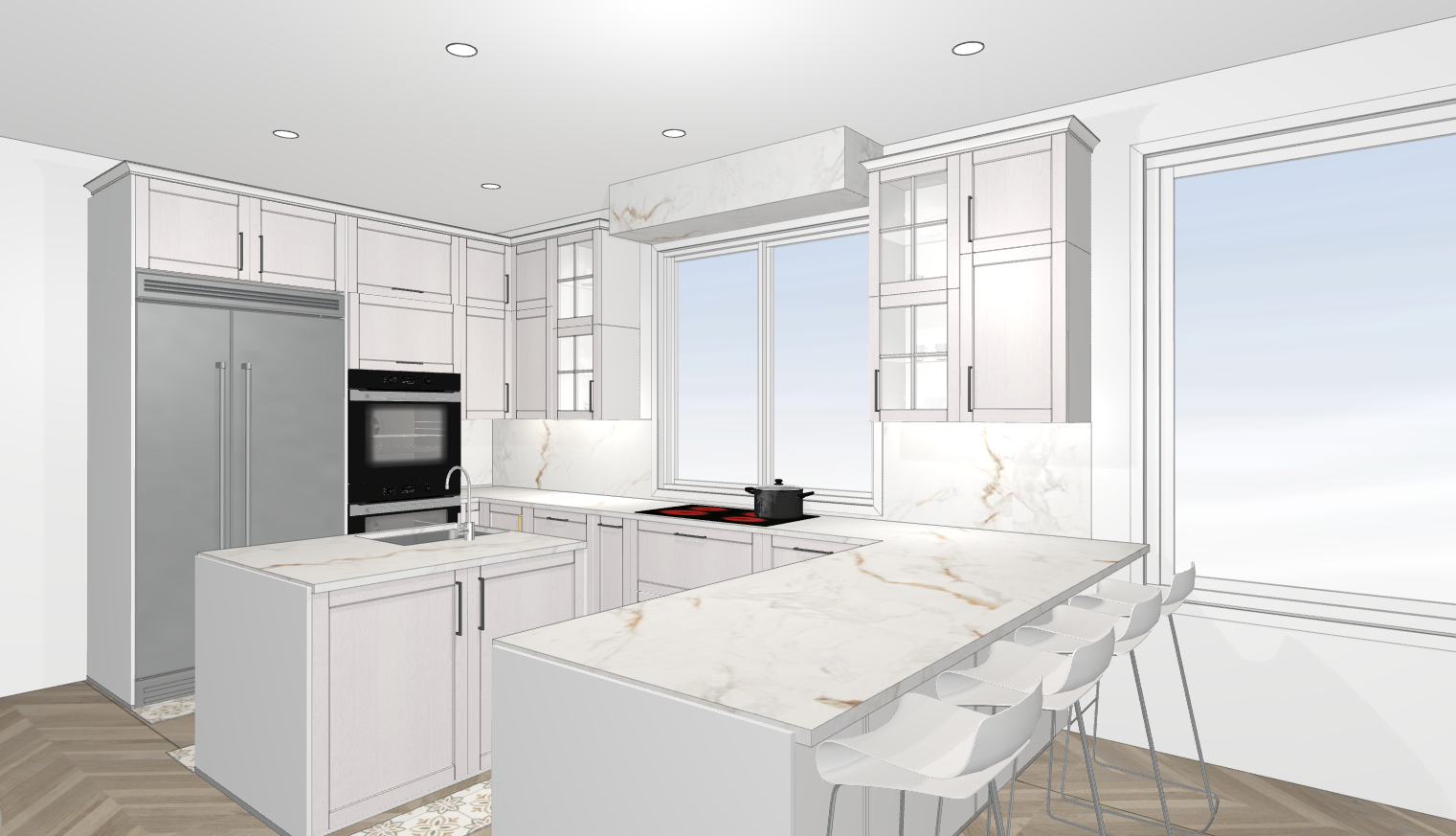 elegant white kitchen with gray and tiled floor
