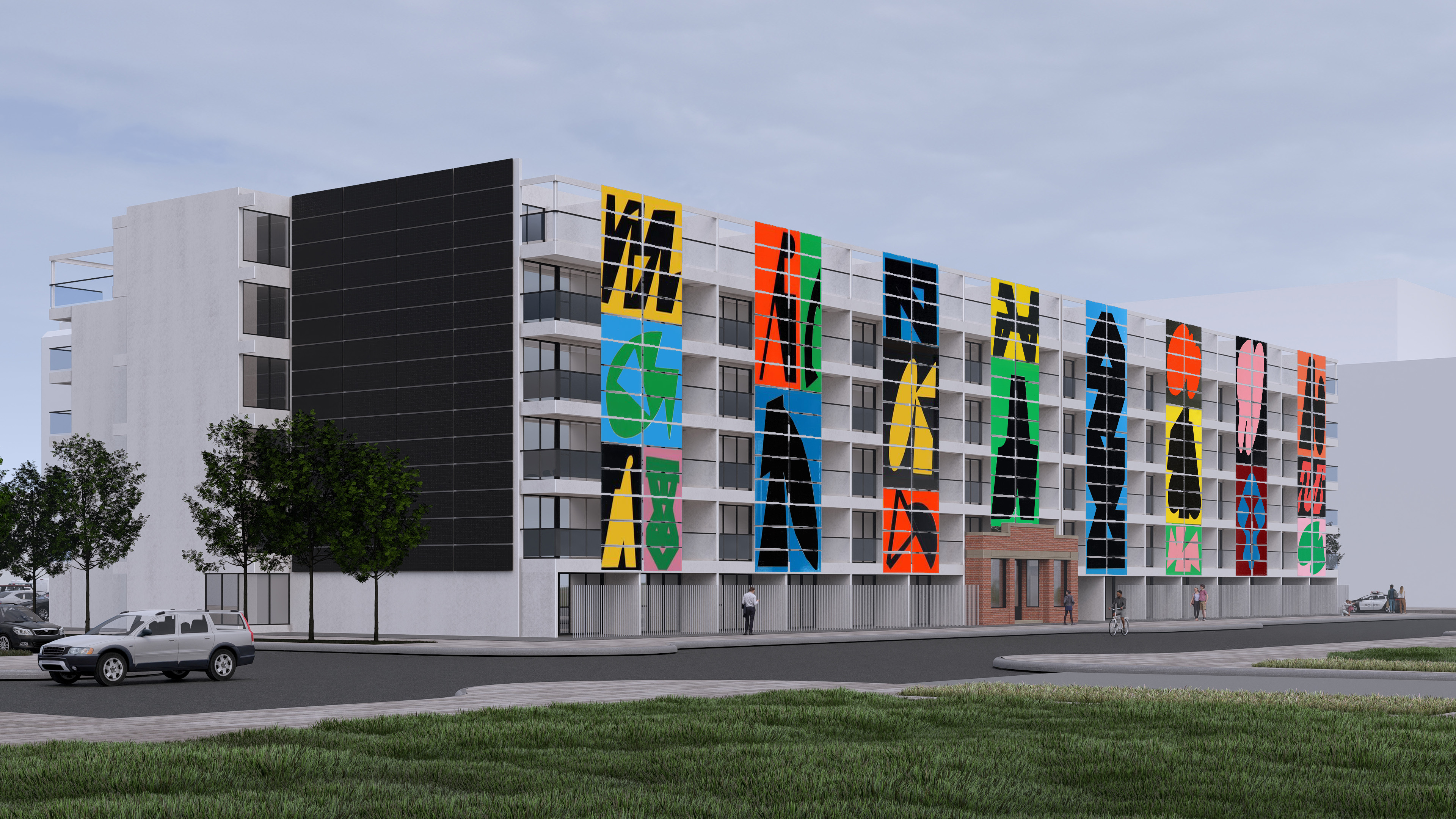 sunny day with a few people on the street and boulevard trees in the foreground wider context