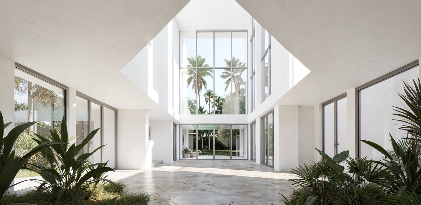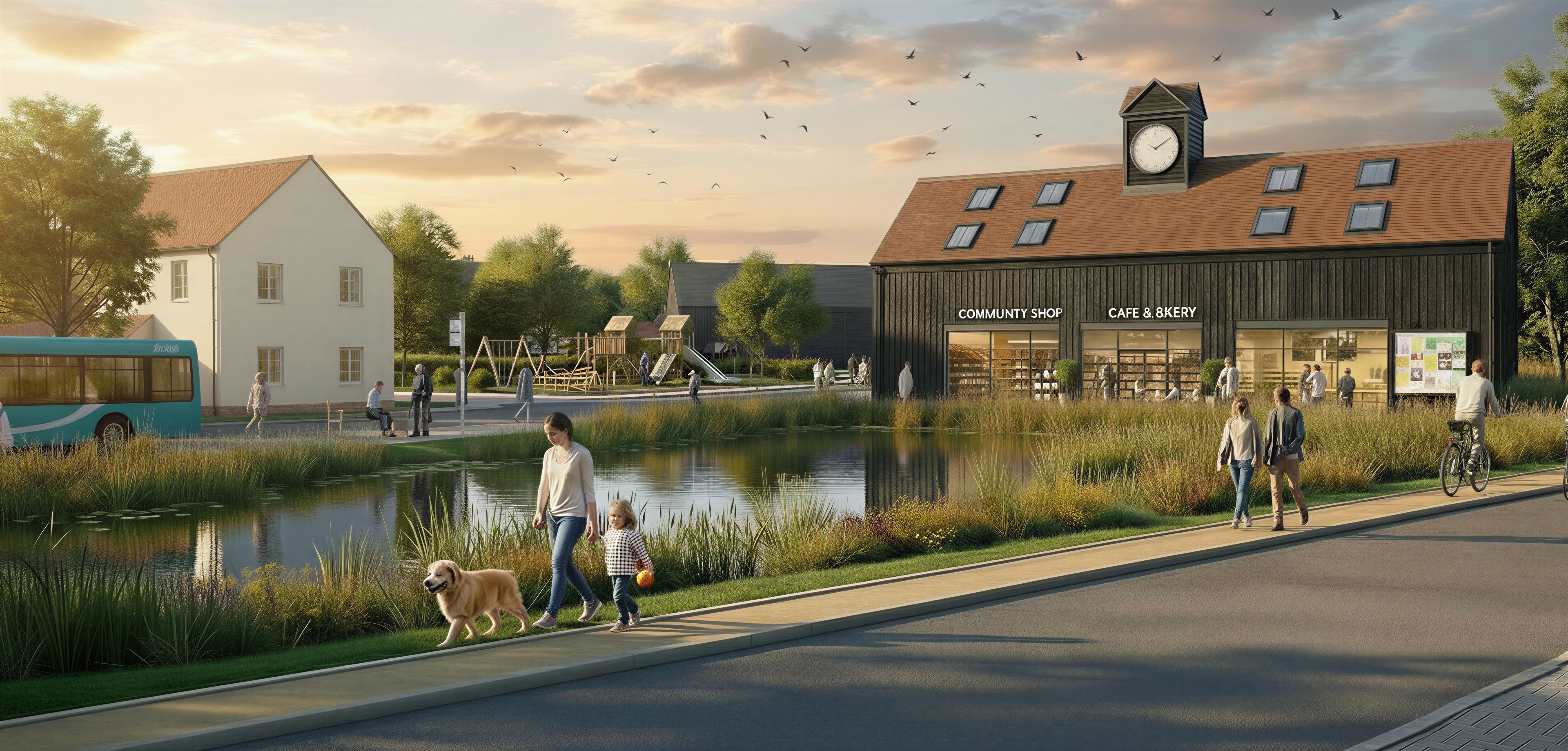 change the design on the building on the right to have a pitched roof and a modern farmstead composition