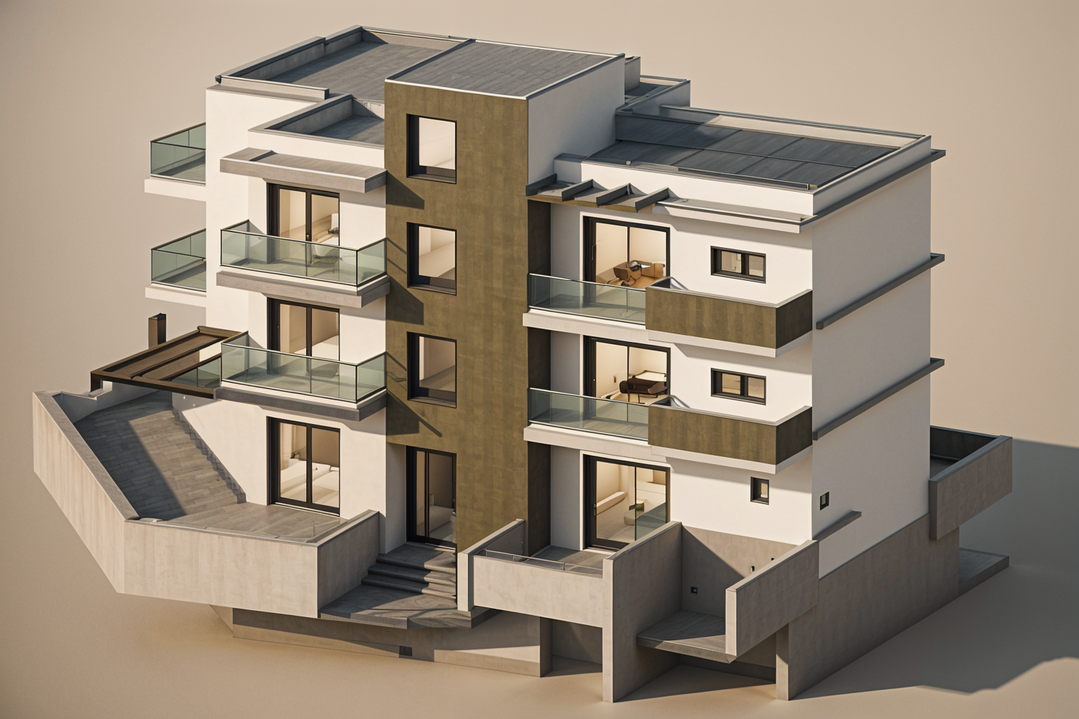 exterior shot white grey walls glass railing turn greens to iron pergolas trees