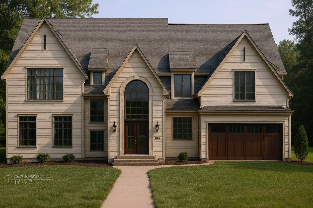 please create rendering with a different front door elevation that is more in line with the rest of the home style use a light warm white brick for the facade of the home please make the front door glass make the trim brick around the windows 2 shades lighter than the overall brick