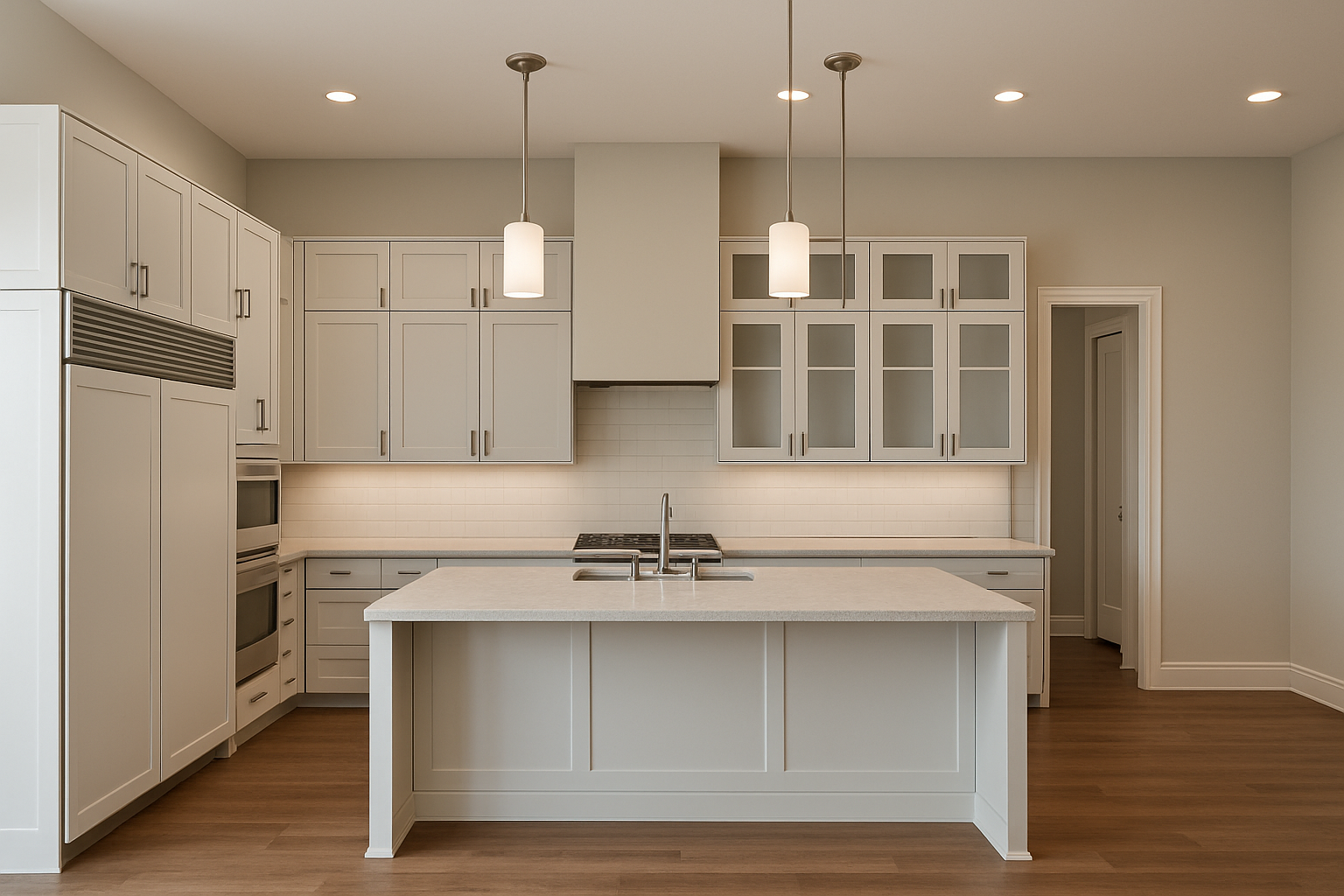 farm house kitchen white oak and glass cab white counter tops under cab lighting toe kick lights black iron pendants lights over island black and wood vent hood