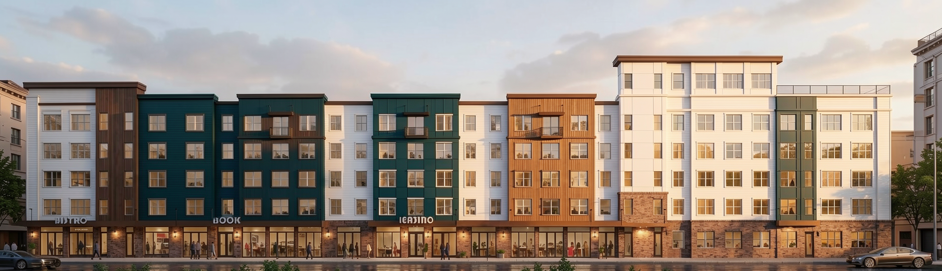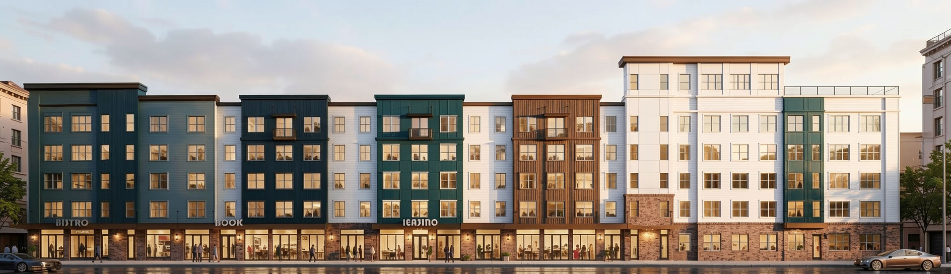 make the large section on the left of the building dark teal also make the large section on the right dark teal the other parts of the building should be wither brown wood or white create some symestry make it feel high end