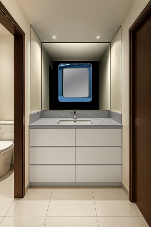 interior shot modern bathroom vanity that is painted light gray blue walls are the same gray bloue color to match the doors and trim are warm walnut finish a vanity mirror is enclosed on three sides the lighting is soft ambient light