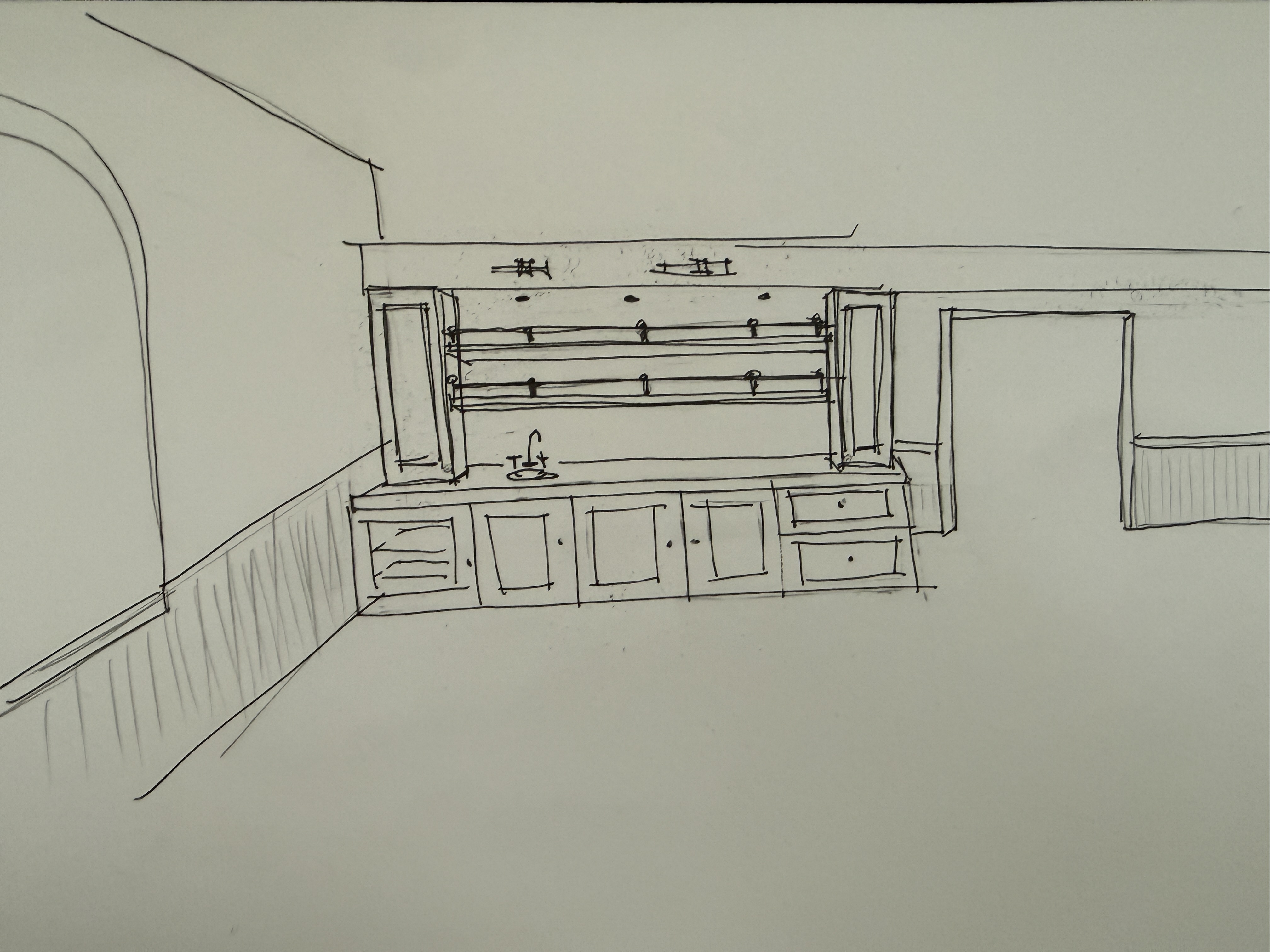 detail shot use this concept sketch of a built in bar to create a rendering use unlacquered brass hardware the backsplash should be antique mirrored glass floors should be hardwood in a walnut stain cabinetry should be in painted wood use farrow and ball s green smoke color style the shelves with glassware and bottles