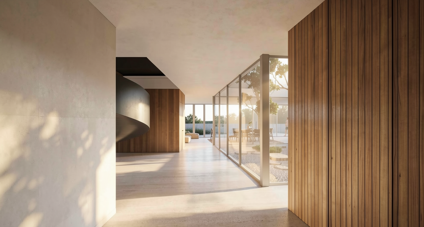 a manicured lawn layered flower beds low maintenance shrubs add a rectangular pool perpendicular to the house on the left side of the house add a glass walled rectangle gazebo with teak furniture and white cushions add fancy landscaping put a black aluminum dance around the pool and gazebo add an outdoor kitchen near the patio stairs add a teak dining set near the outdoor kitchen add a light gray slide to the far left side of the pool make the siding sherwin williams iron ore color do not add any brick or stone make the roof charcoal make the windows black no steps