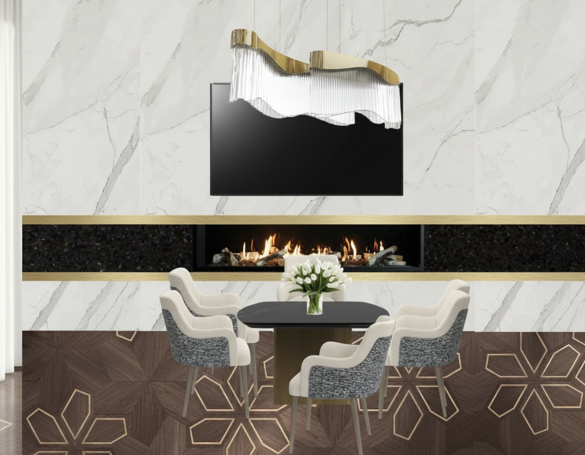 exterior shot hyper realistic modern luxury interior featuring a full height marble feature wall in soft white and light gray tones with delicate natural veining centered on the wall is a sculptural statement chandelier with layered white glass elements and brushed gold accents fully supported with visible suspension cables and ceiling canopy for realism directly below the fixture a sleek black flat screen tv is mounted flush to the wall beneath the tv a contemporary linear fireplace is seamlessly integrated into the wall framed with a subtle black tiled border emitting a warm natural flame glow in the foreground place a rectangular black dining table to fit 6 chairs with a smooth matte finish styled with a fresh arrangement of white tulips in a minimal vase surround the table with six elegant dining chairs featuring cream upholstered seats and textured gray backrests with refined modern silhouettes flooring is dark brown wood with a geometric pattern slightly reflective adding depth and richness to the space lighting is soft and balanced warm ambient glow from the fireplace subtle golden illumination from the chandelier natural daylight softly filling the space creating gentle shadows and realistic highlights enhance material realism high detail marble texture with visible veining variation soft fabric grain on chairs realistic wood grain and slight sheen on flooring subtle reflections on black surfaces and metal accents camera eye level perspective slightly angled toward the feature wall capturing depth and composition no distortion cinematic framing style ultra realistic high end residential interior luxury clean composition no clutter