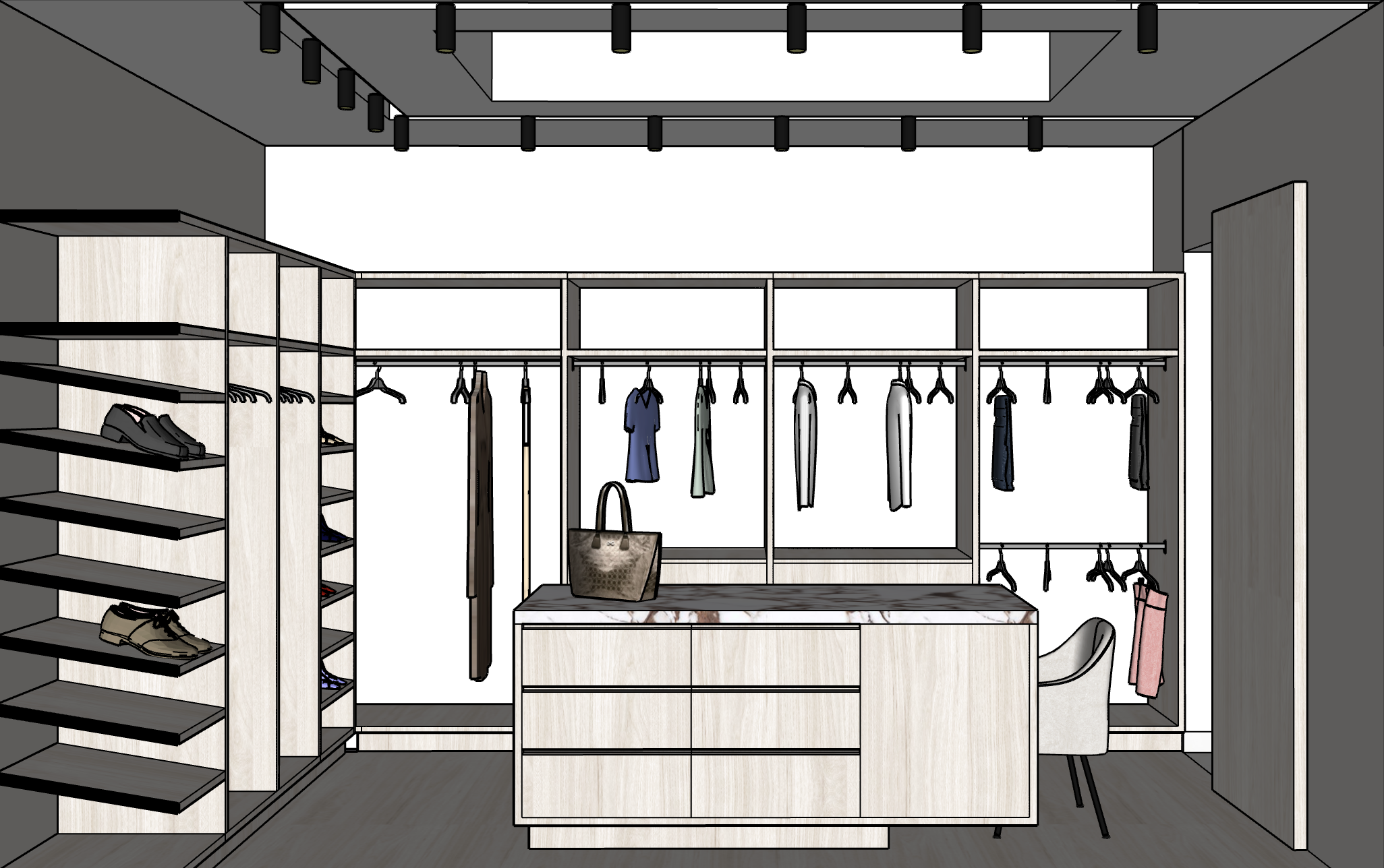 render of a modern walk in closet interior the space features light wood cabinetry open hanging sections floating shelves for shoes on the left and a central island with drawers and a marble countertop include subtle fabric textures on hanging clothes a leather handbag on the island and a soft upholstered chair beside it the flooring is the same light wood the ceiling is white with recessed track lighting and a skylight and the walls are white the lighting should be natural and evenly distributed with soft shadows and realistic material reflections render in a clean minimal high end residential style