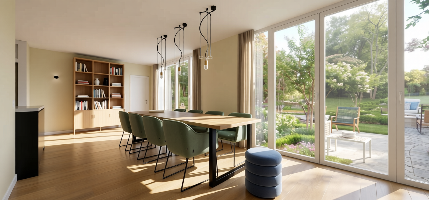 important preserve the existing geometry and the existing context exactly as provided preserve the existing windows do not add new windows do not modify alter reinterpret add remove scale or reshape any geometry do not change the site surroundings street layout neighboring buildings vegetation or context elements do not modify geometry scale proportions buildings road layout sidewalks or surrounding context in any way do not modify text soft noon atmosphere diffused neutral natural daylight with subtle cold tones cinematic architectural mood warm interior lighting 4000k glowing from inside creating slight contrast between cool exterior and warmish interior large glass surfaces with realistic reflections soft mirror effect environmental reflections of sky and surroundingsimportant do not add new windowsmake it darker remove the people