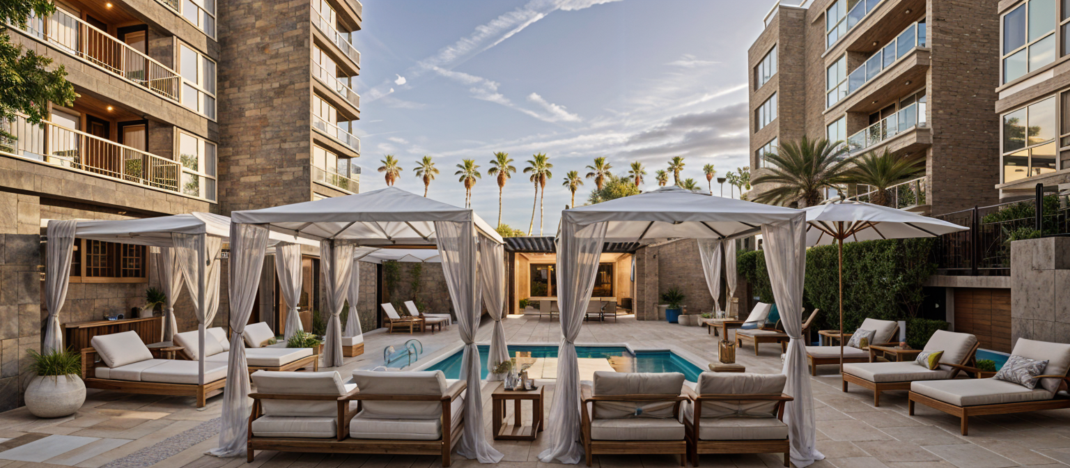 render a serene suburban landscape featuring a series of charming houses with beige stucco exteriors and dark grey roofs nestled on a gentle green hillside capture the vibrant green of the manicured lawn and scattered shrubs the sky is clear and blue dotted with a few fluffy white clouds suggesting a peaceful sunny day the atmosphere is calm and inviting with soft sunlight casting gentle shadows enhancing the tranquil suburban setting architecture