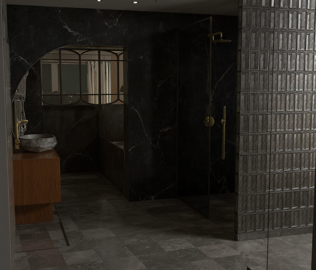 marbre noir et dor pav de verre gris meuble en bois vasque en pierre verri re art d co sur salon plafond spots robinet dor romantique sombre