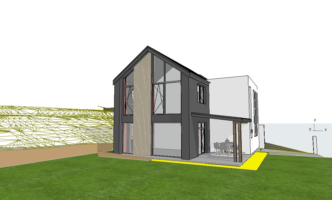 barndominium exterior shot in an australian rural setting at sunset with a lush green garden external colour pallette of white and soft grey architecture change background to forest keep color combinaton to facade and wood insertion to faccade