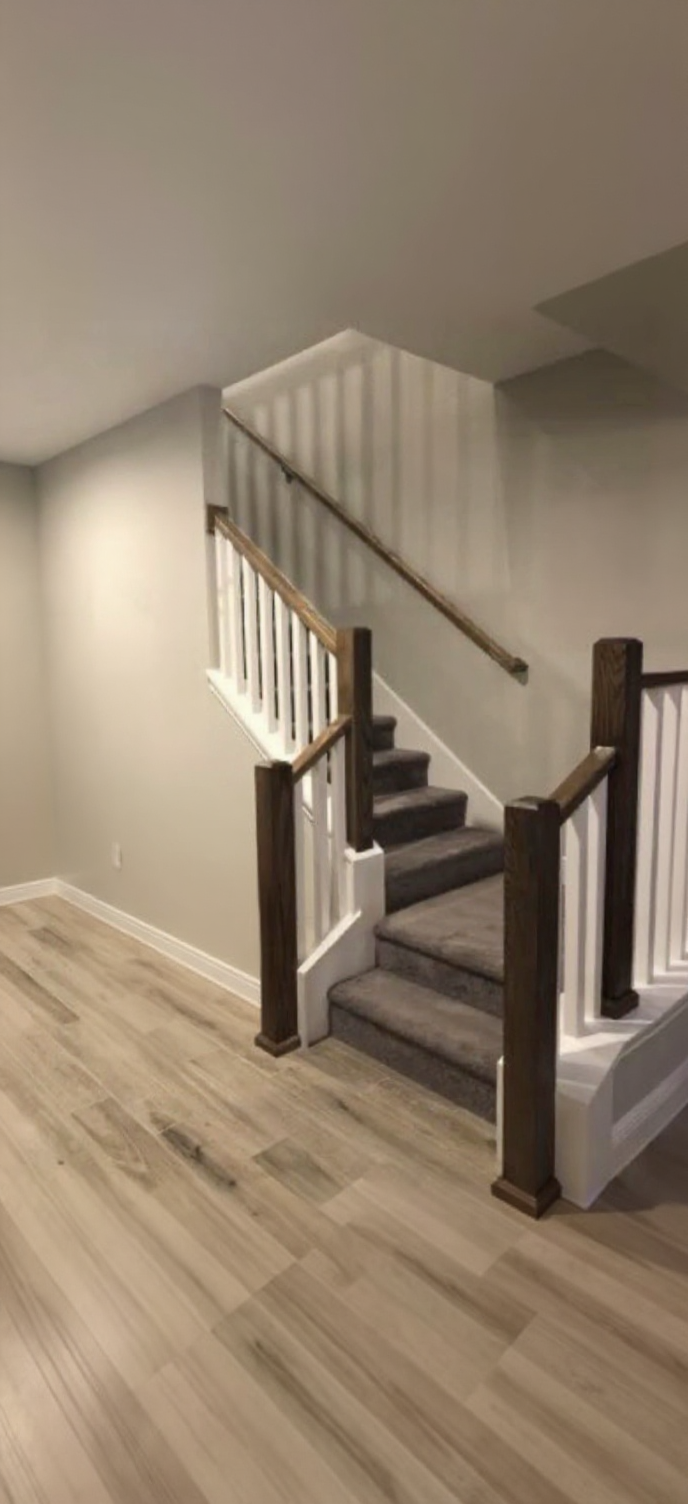 interior shot show facing the steps add a column at the landing on the left where the steps come down and add one more step to the bottom also add a header along the ceiling top of the steps