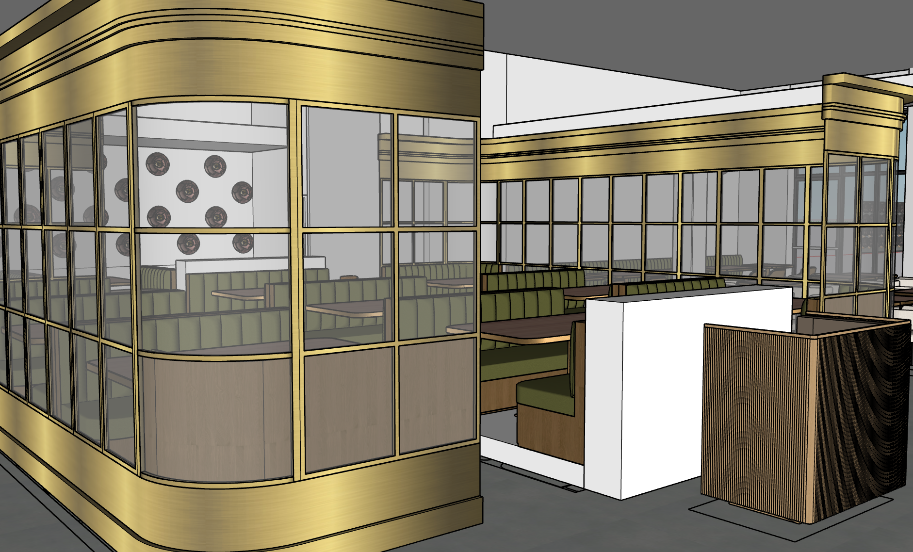 ultra detailed photorealistic interior render of a restaurant strictly based on the provided 3d model preserve exactly the original architectural layout proportions dimensions furniture placement booth configuration partitions ceiling elements and camera angle no modifications no reinterpretation no added or removed elements convert the model into a high end restaurant visualization using realistic materials and lighting olive green upholstered booth seating in premium leather or velvet soft stitching and subtle wear warm medium tone wood paneling on booth bases with natural grain detail dark stained wood tabletops with soft reflections brushed brass aged gold metal frames and curved soffits with realistic patina and subtle imperfections clear glass partitions with accurate reflections and refractions back feature wall with evenly spaced circular decorative elements ceramic plates or sculptural discs slightly glossy finish lighting cinematic warm ambient lighting 2700k 3000k soft indirect lighting integrated under soffits and along partitions subtle pendant or concealed lighting sources enhancing depth volumetric lighting with gentle light falloff and realistic shadows high dynamic range hdr global illumination ray traced reflections rendering style ultra realistic materials pbr workflow micro details fabric texture wood grain metal imperfections fingerprints slight wear depth of field very subtle keeping most of the scene sharp balanced exposure soft contrast natural color grading camera composition maintain the exact original camera position focal length framing and perspective symmetrical composition emphasizing the central aisle and back feature wall quality 8k resolution architectural visualization quality sharp noise free highly detailed important do not redesign restyle or change the layout only enhance realism and materials based on the existing model