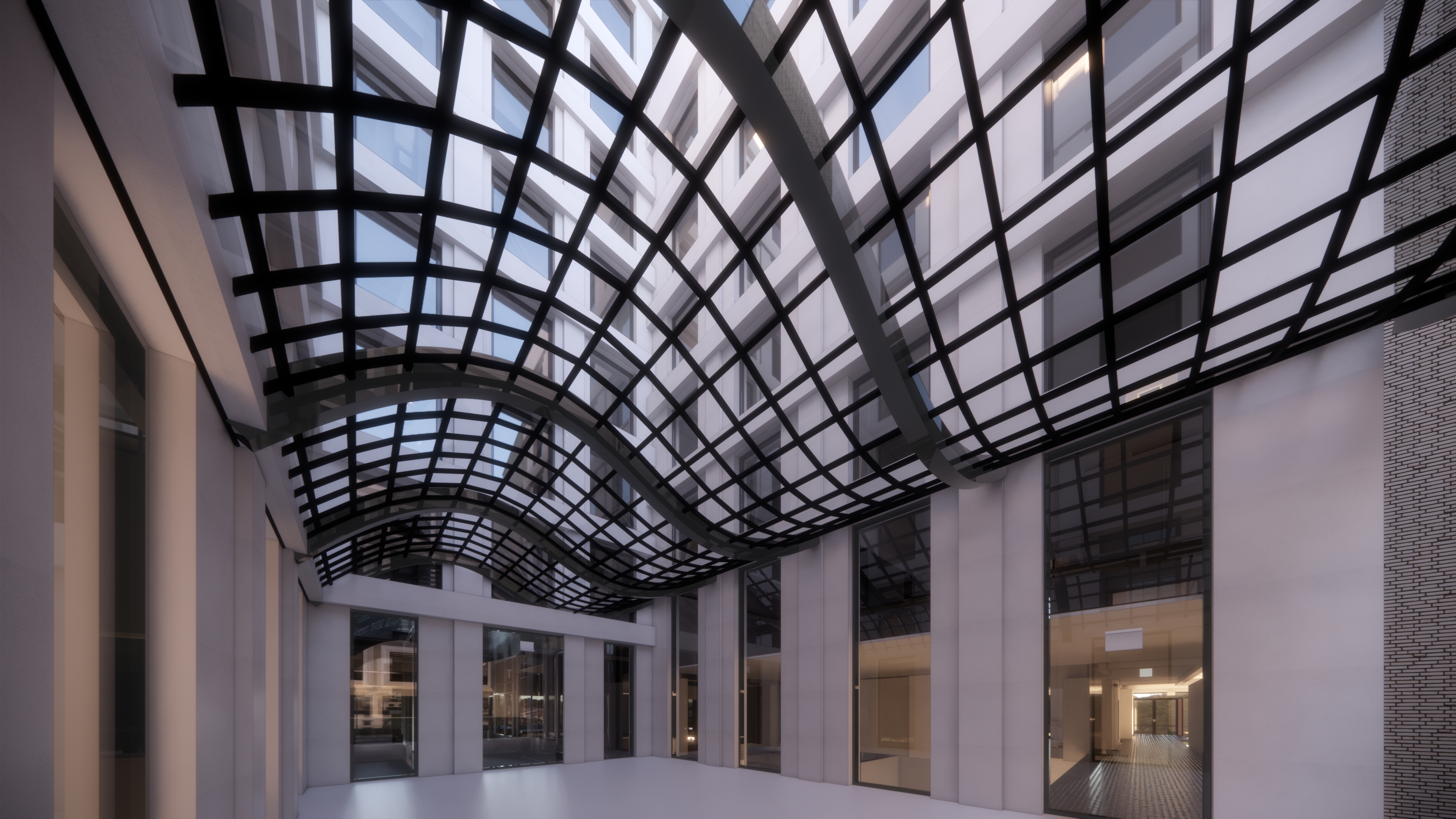 improve reflection and light in this courtyard add people and a small water sculpture on the right there is an hotel entrance