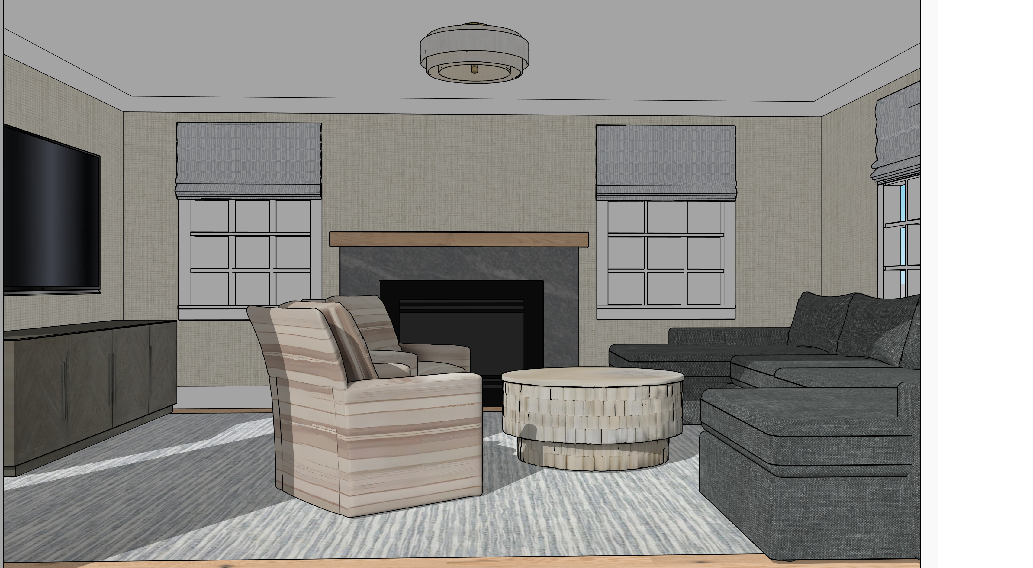 the uploaded image is a finished sketchup interior scene with final materials already applied preserve the camera angle room layout and furniture placement exactly as shown all materials must remain unchanged including the fabric the upholstery the rug the fireplace surround the mantel and the wood flooring do not reinterpret fabrics colors or textures enhance the image by adding realistic lighting shadows and material depth only to create a photorealistic architectural rendering strict preservation keep all fabrics patterns colors and materials exactly as shown material fidelity required