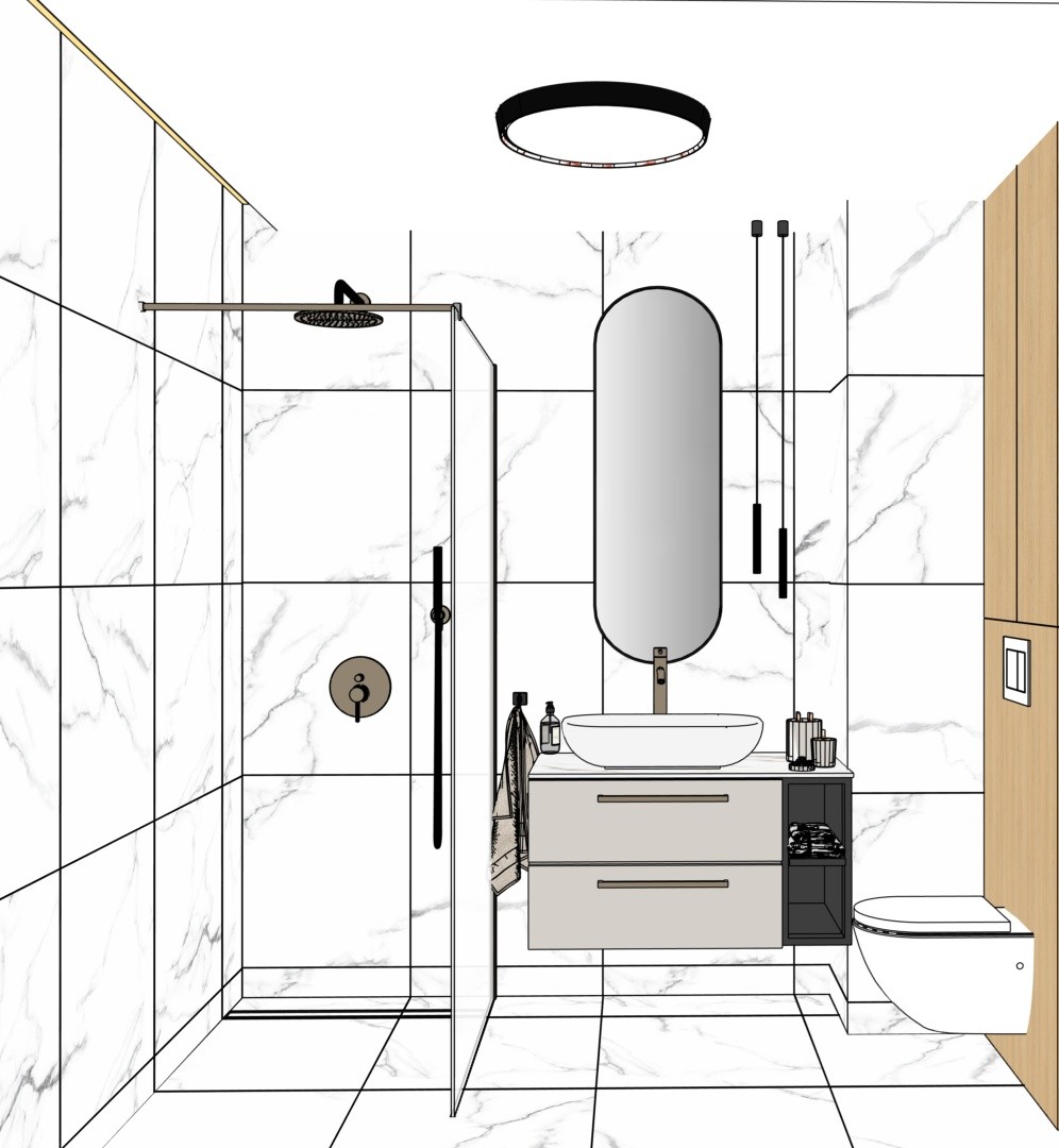fotorealistyczna fotografia wn trza klasy premium projekt uk ad meble i materia y bez adnych zmian wzgl dem obrazu wej ciowego naturalne wiat o dzienne perfekcyjna ekspozycja naturalny balans bieli bardzo realistyczne materia y i detali zero zmian zero okien p ytki w ca ej azience wygl daj jak marmur z delikatn szar y k prysznic i bateria prysznicowa i umywalkowa jest w kolorze mosi dzu szczotkowanego zlew i wc jest w kolorze bia ym obok lustra wisz dwie czarne w skie lampy lustro z czarn ramk z o wietleniem led za lustrem