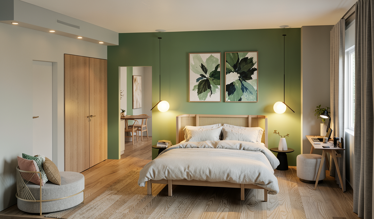 add sage green art above the bed recessed spotligts on the false ceiling of the wall on the left and above the wooden sliding doors of the closet warm lights scandinavian vibes