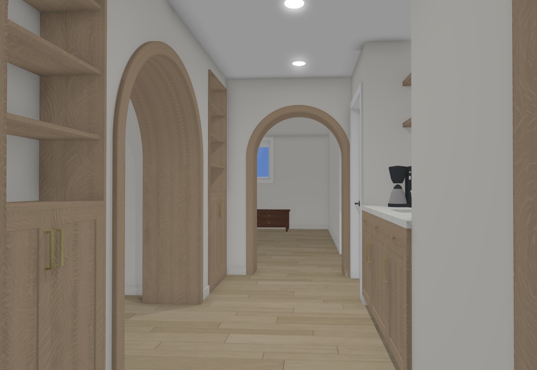 transitional highway with white oak flooring and white oak arched openings cabinetry on the right of the hallway is white oak with white marble countertops and a coffee machine arched doorway to the left opens to the bathroom at the end of the hall and arched doorway opens into a bedroom filled with natural light 8k hyperrealistic image