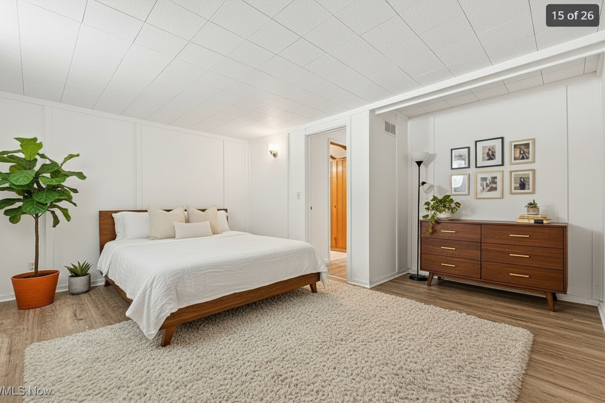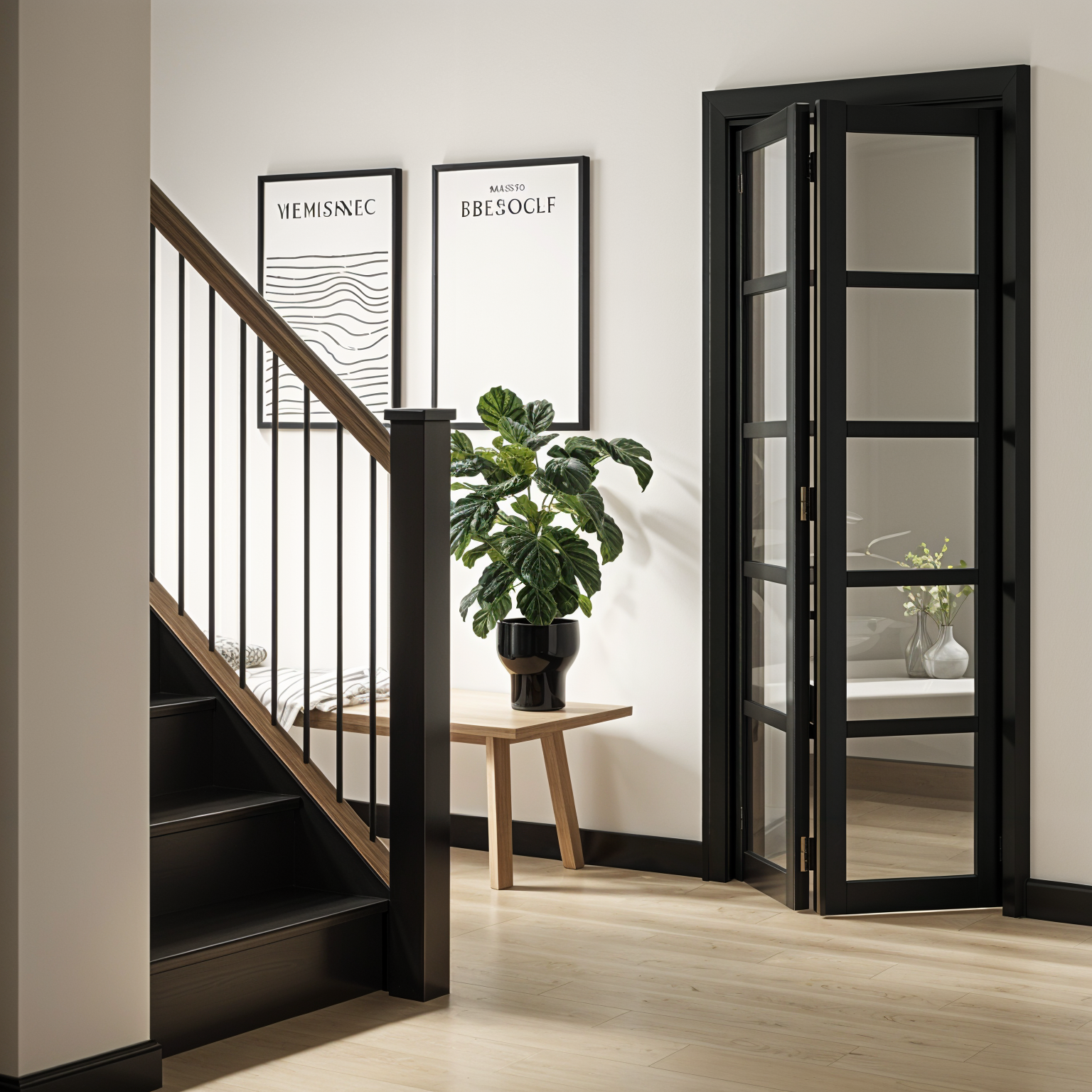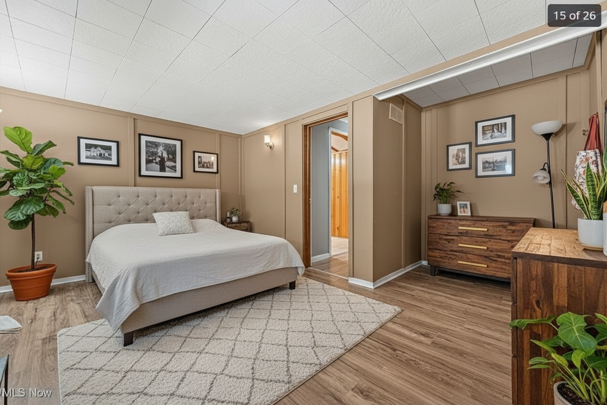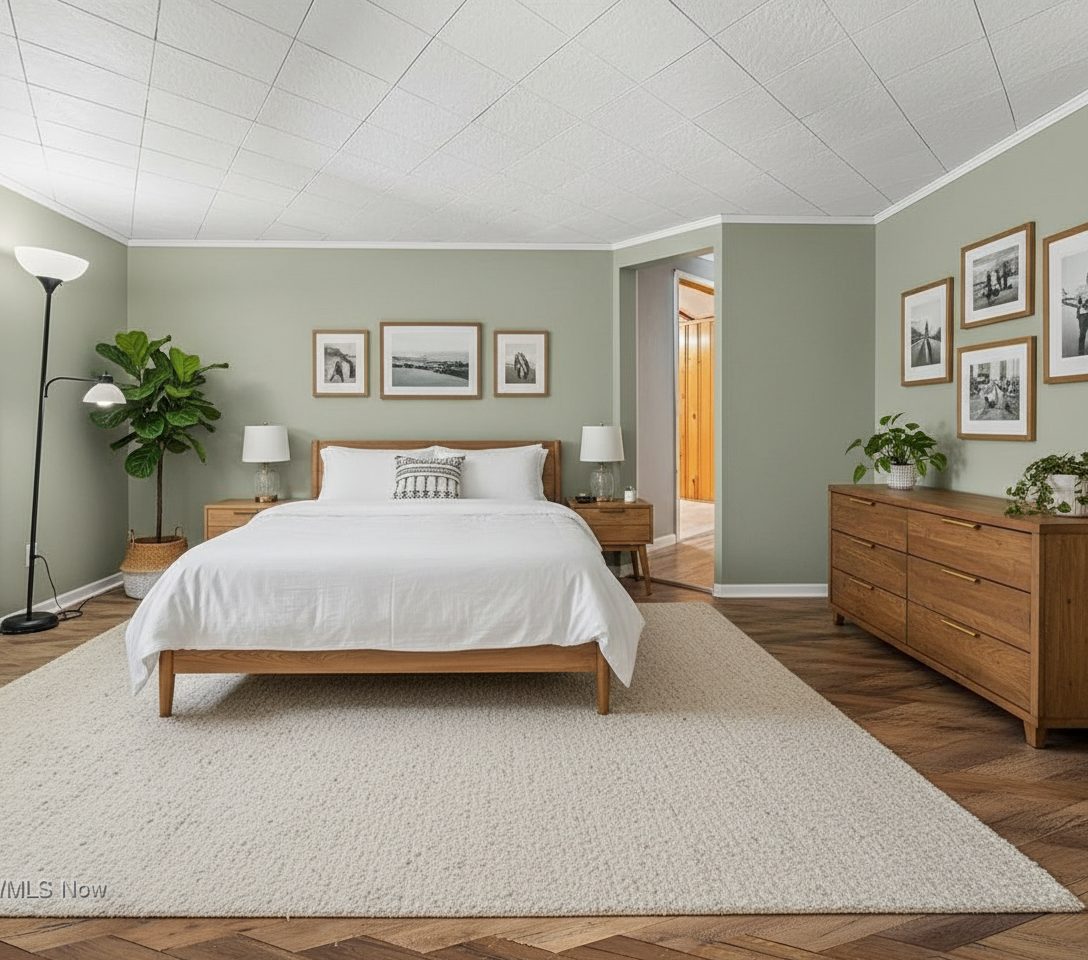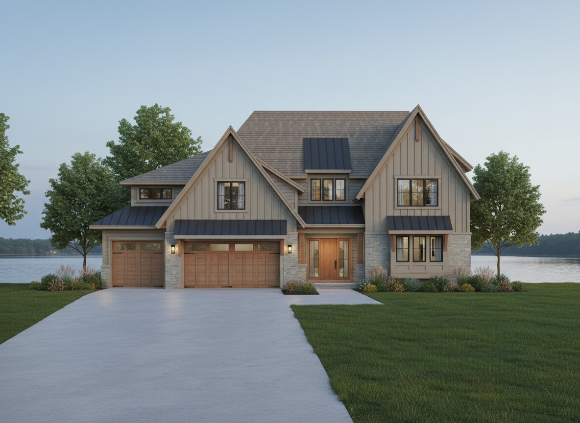 create a high end photorealistic 3d exterior architectural rendering based on the provided reference image maintaining the same architectural style proportions materials and evening lakefront setting with the following design modifications applied precisely massing changes pull the entire garage volume forward 20 feet so it clearly projects in front of the main house massing and the front porch keep the remainder of the house main living mass and porch set back relative to the garage projection maintain realistic roof transitions eave alignments wall offsets and structural logic after shifting the garage forward exterior materials remove all stone from the front facing gables replace stone at gable faces with vertical board and batten siding retain light stone veneer on the lower walls and garage surrounds only architecture materials unchanged unless noted two story modern craftsman transitional luxury home with multiple steep front facing gables warm greige vertical board and batten siding with complementary horizontal siding on secondary walls charcoal or dark bronze standing seam metal roof accents over the garage volume and select lower roof planes taupe architectural shingle roof above black or dark bronze window frames with tall clean proportions warm natural wood garage doors with subtle horizontal detailing and upper glass lites covered front porch with wood posts stone base columns and a warm wood front door site setting smooth light gray poured concrete driveway and sidewalks extending to the forward projected garage finished summer landscaping with lush green lawn ornamental grasses shrubs and small trees in full leaf calm natural lake in the background with soft reflections and distant tree line positioned naturally behind the home lighting mood early evening dusk lighting with a soft blue hour sky warm interior light glow visible through windows subtle exterior lighting at the entry and garage gentle reflections on metal roofing glazing and lake surface camera quality straight on to slightly angled front elevation at eye level accurate scale crisp materials balanced exposure and realistic proportions ultra realistic architectural visualization suitable for client presentation