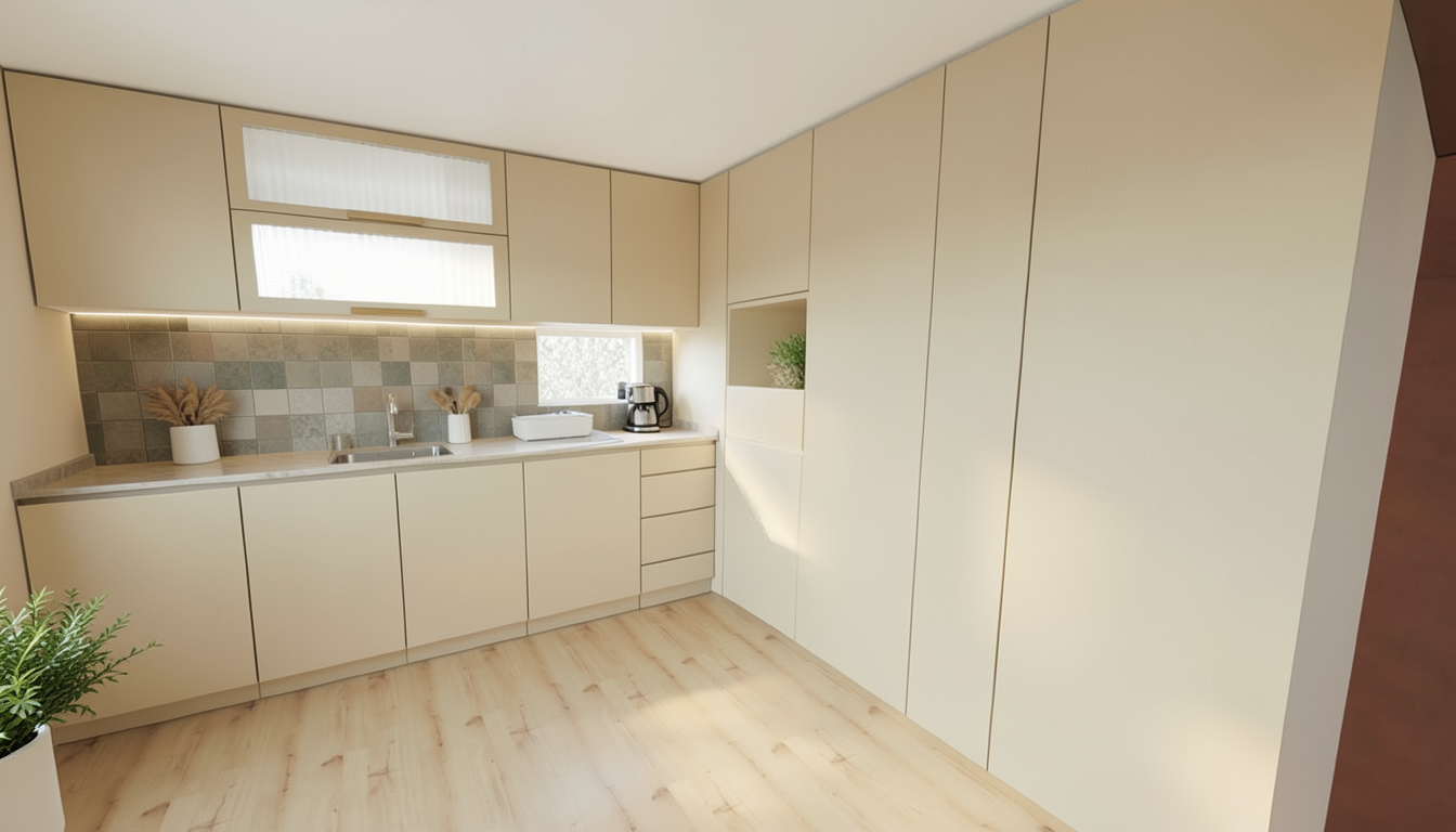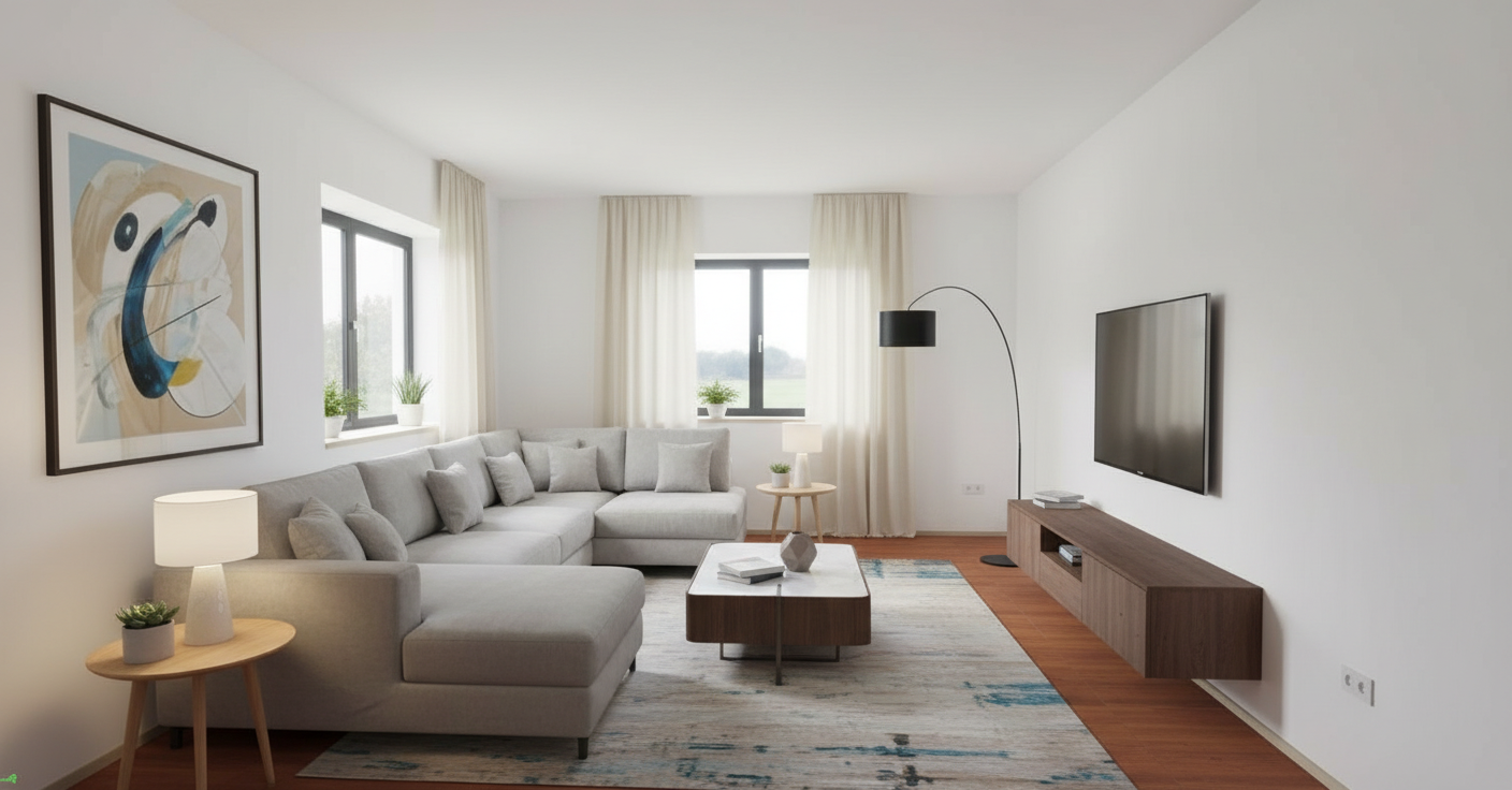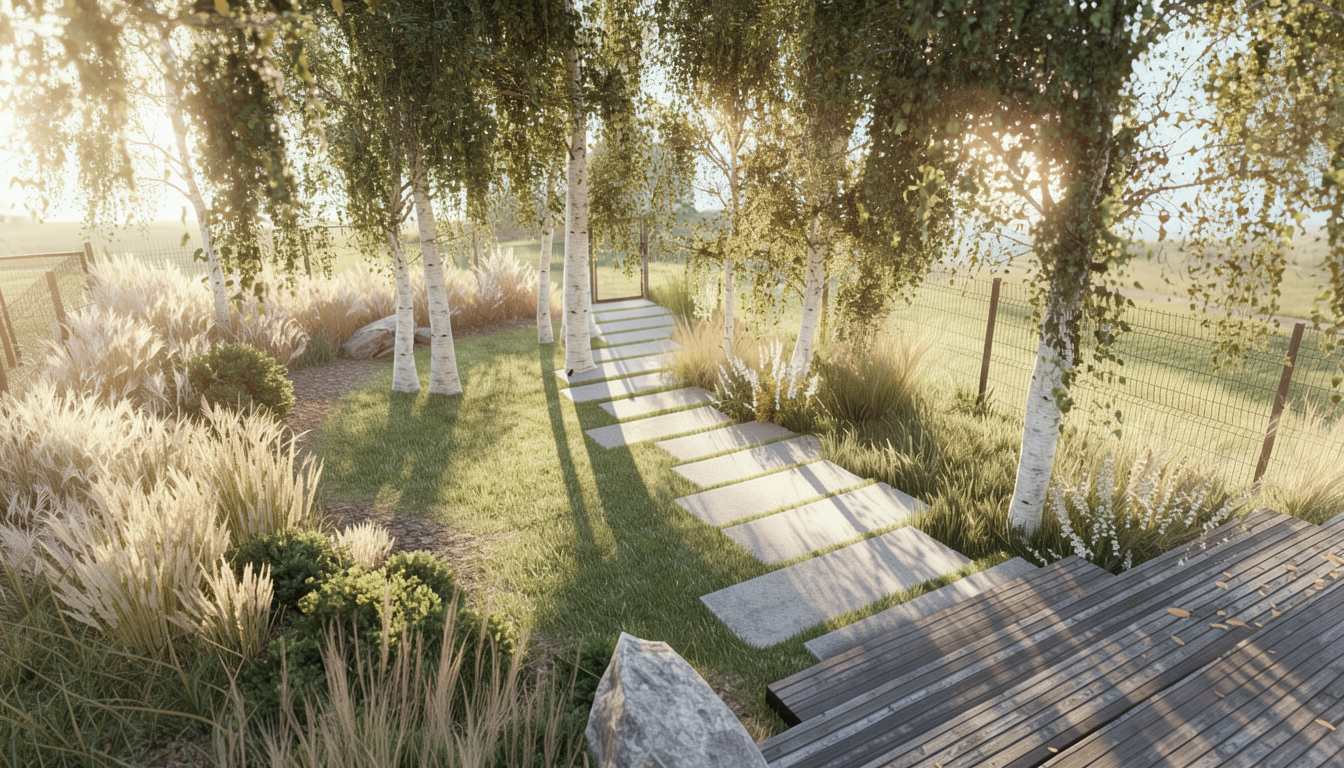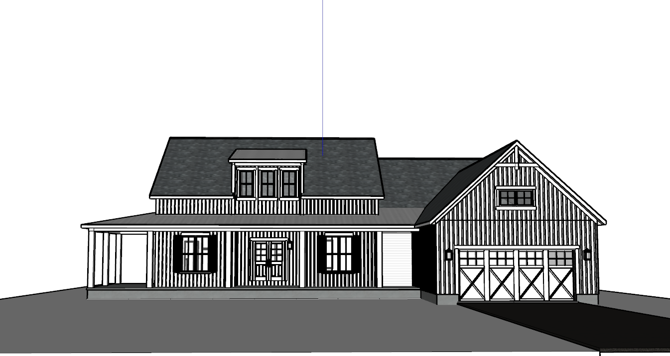 make as photorealistic as possible while keeping textures the same as selection professional landscaping in a lightly wooded scene with good lighting dark grey siding dark roof only show the brown front door white garage door