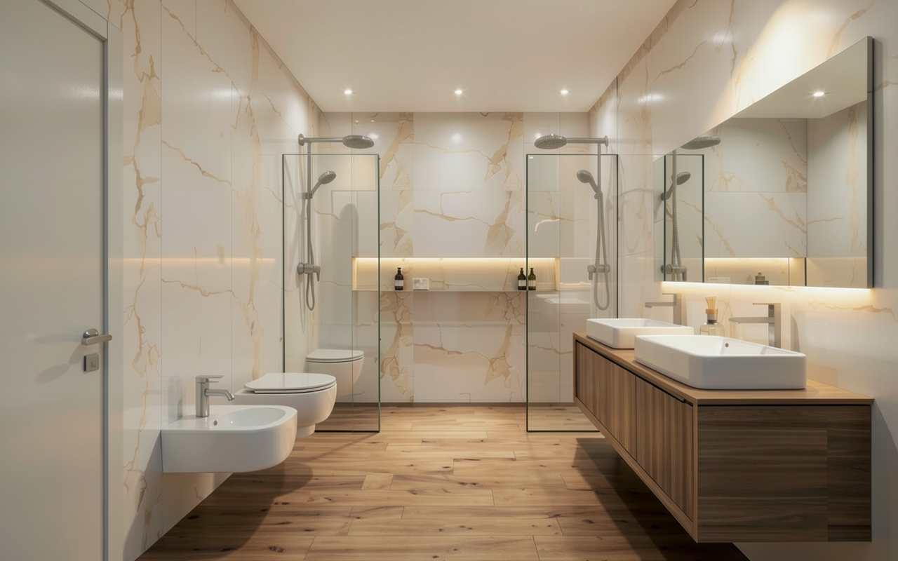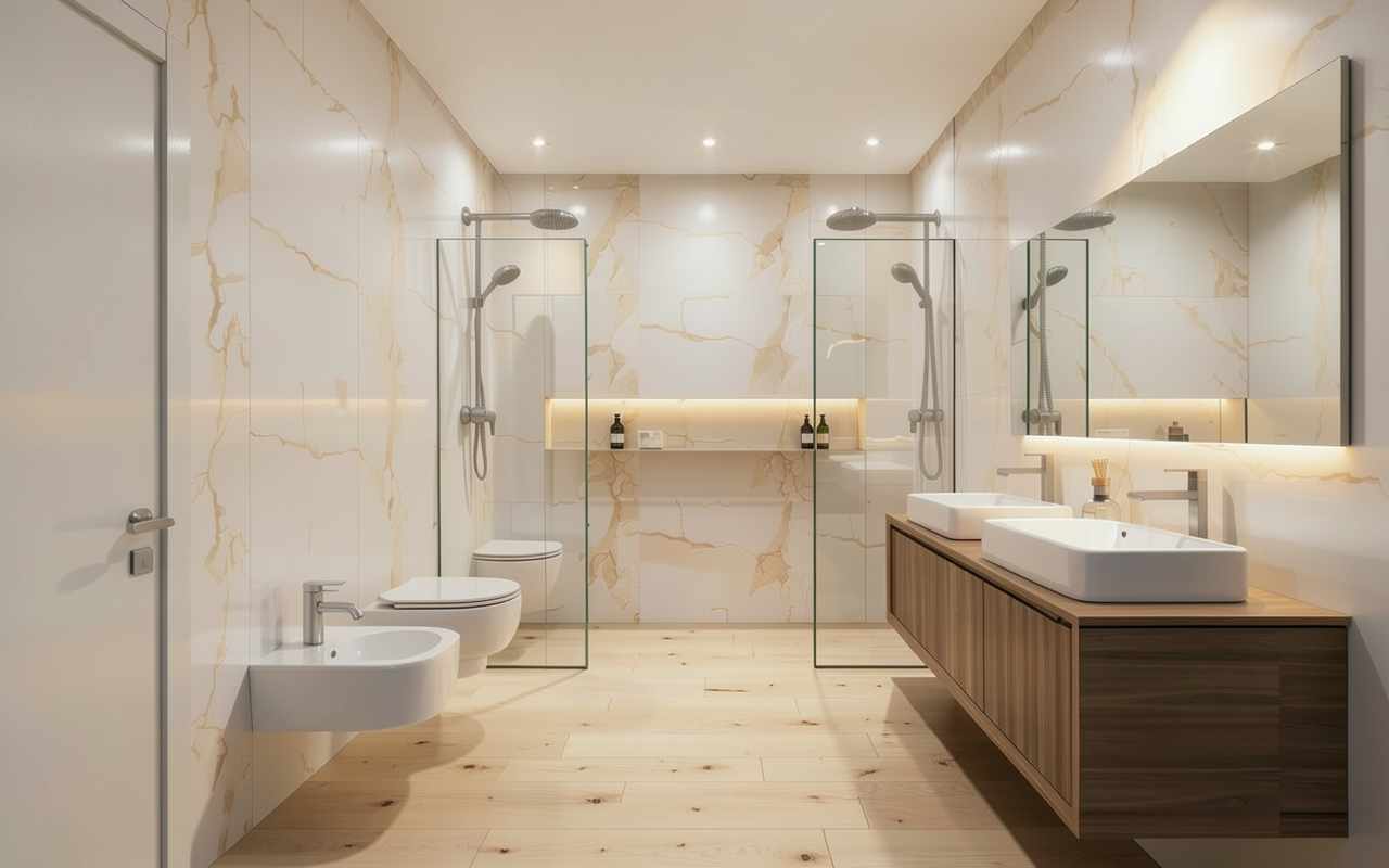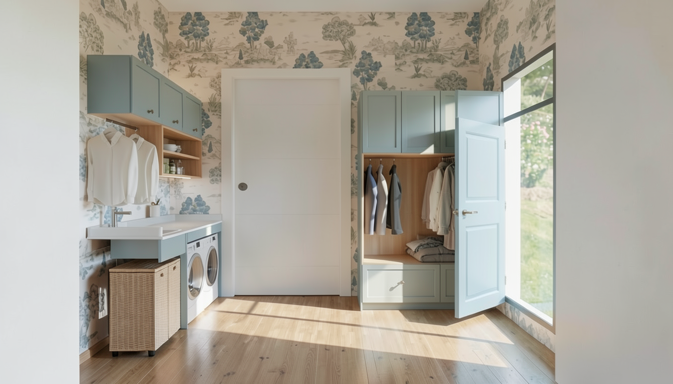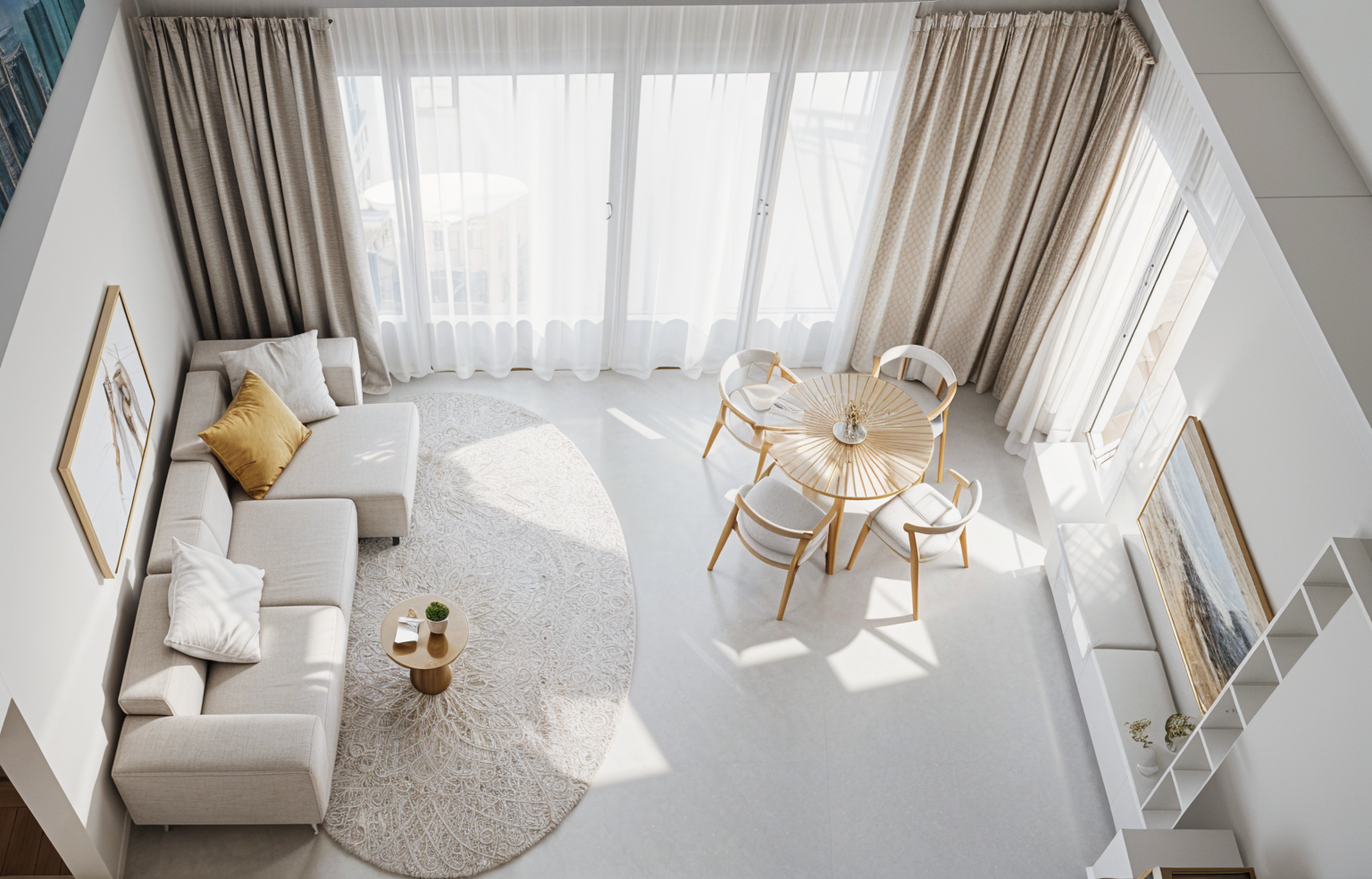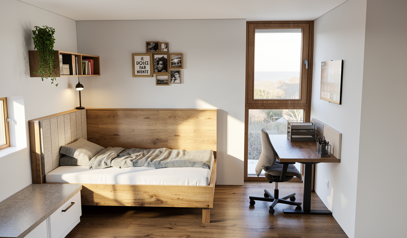the rendered image should feature clean natural daylight as the dominant light source with soft diffused daylight entering through large openings the lighting should be well balanced avoiding excessive contrast or overexposure while ensuring that details remain clearly visible even in shaded areas the scene should also include 4000 kelvin interior artificial lighting the neutral white tone of this lighting should harmoniously complement the daylight the artificial light must not dominate the scene it should subtly enhance spatial depth and highlight material textures colors must remain accurate and natural with no color shift toward warmer or cooler tones the white balance should be neutral and the render should faithfully represent the original material finishes and shades the overall image should be clean sharp and photorealistic matching the original design as closely as possible in terms of composition proportions and material representation avoid excessive post processing oversaturation or stylization the goal is a realistic and authentic visual presentation adjust the colors remove the window from behind the shelving cabinet put a solid colored ruffled duvet cover on the bed the wall color is powder peachy pink adjust the curtain color back to something as close as possible to its original color in the image