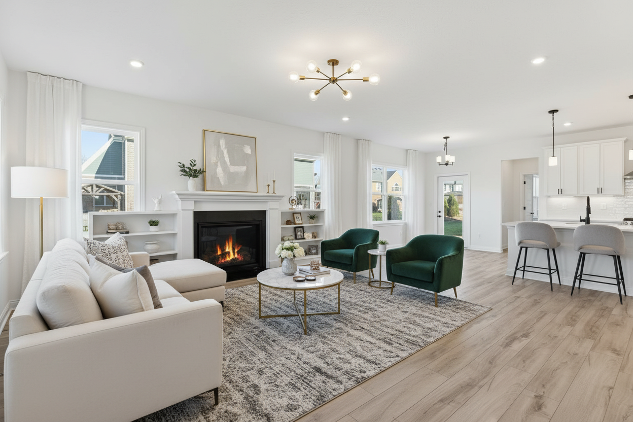 remove the bookcases on each side of fireplace add a small light wood table with 4 chairs to the dining nook area under the black 3 light chandelier change the great room gold chandelier to a black one similar to kitchen and dining nook fixtures