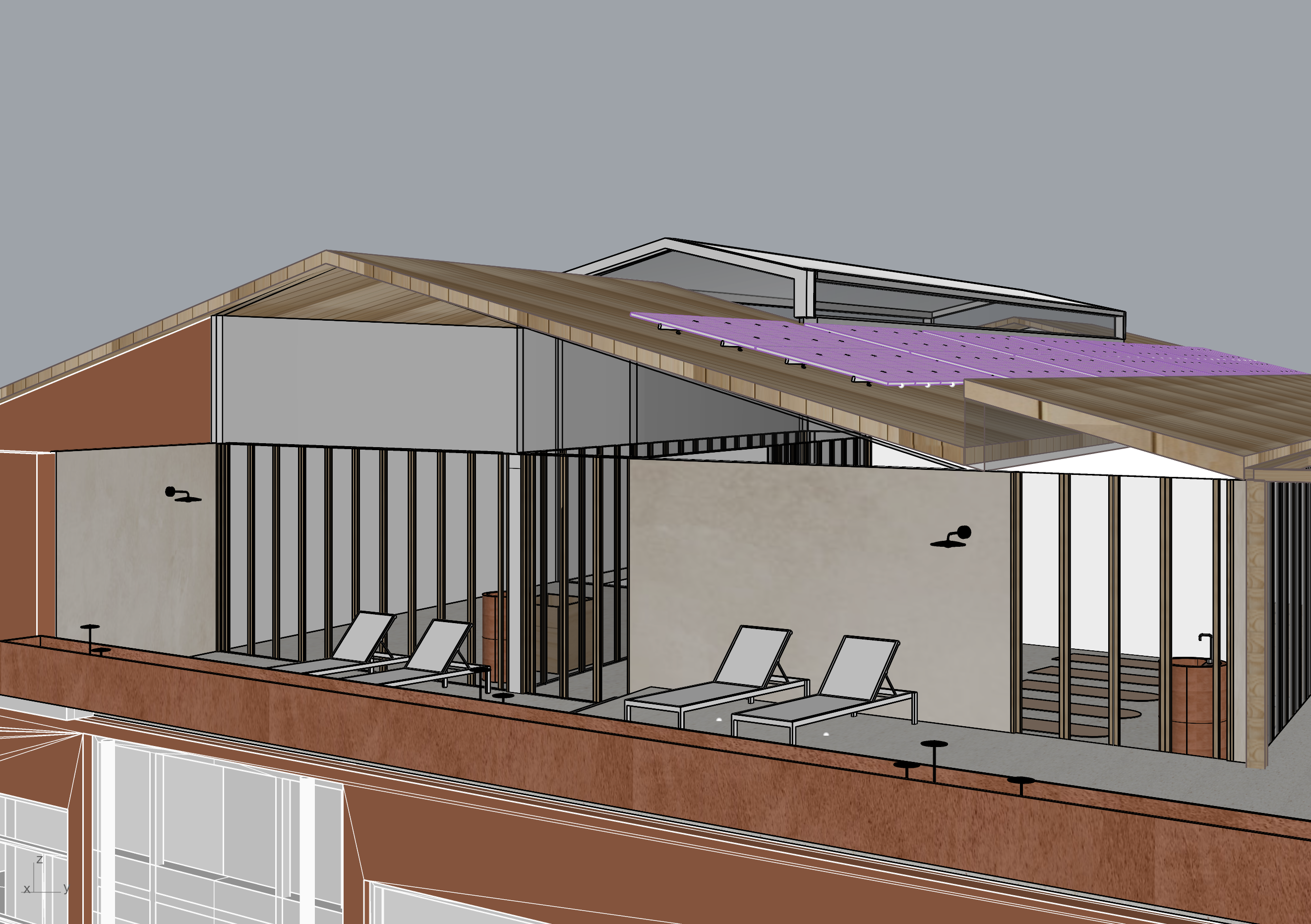 the red is terracotta the solid walls are light beige stucco material there are glazed operable walls with wood framing all wood is pine wood the roof is pine wood in planks witha retractable skylight on top also solar panels on the roof you can see two studios inside the one to the left behind the glazed walls is a reformer pilates studio please add some reformer pilates benches in there the other studio is where you can see yoga mats on the ground the wall behind the glazed walls in the reformer pilates studio on the left is mirrored on the edge of the terrace there is a bespoke planter in terracotta put plants in here the two terracotta plinths you can see in each studio is bespoke water drinking fountains in terracotta the floor surface both inside and out on the terrace is light terrazzo you can see some lamps hanging on the walls outside these shine light downwards in the planters there are also some lamps as you can see they are also lighting downwards the lamps on the walls are black the solid wall in the yoga studio is also mirror not stucco can you add more plants in the bespoke planters on the edge of the terrace as well