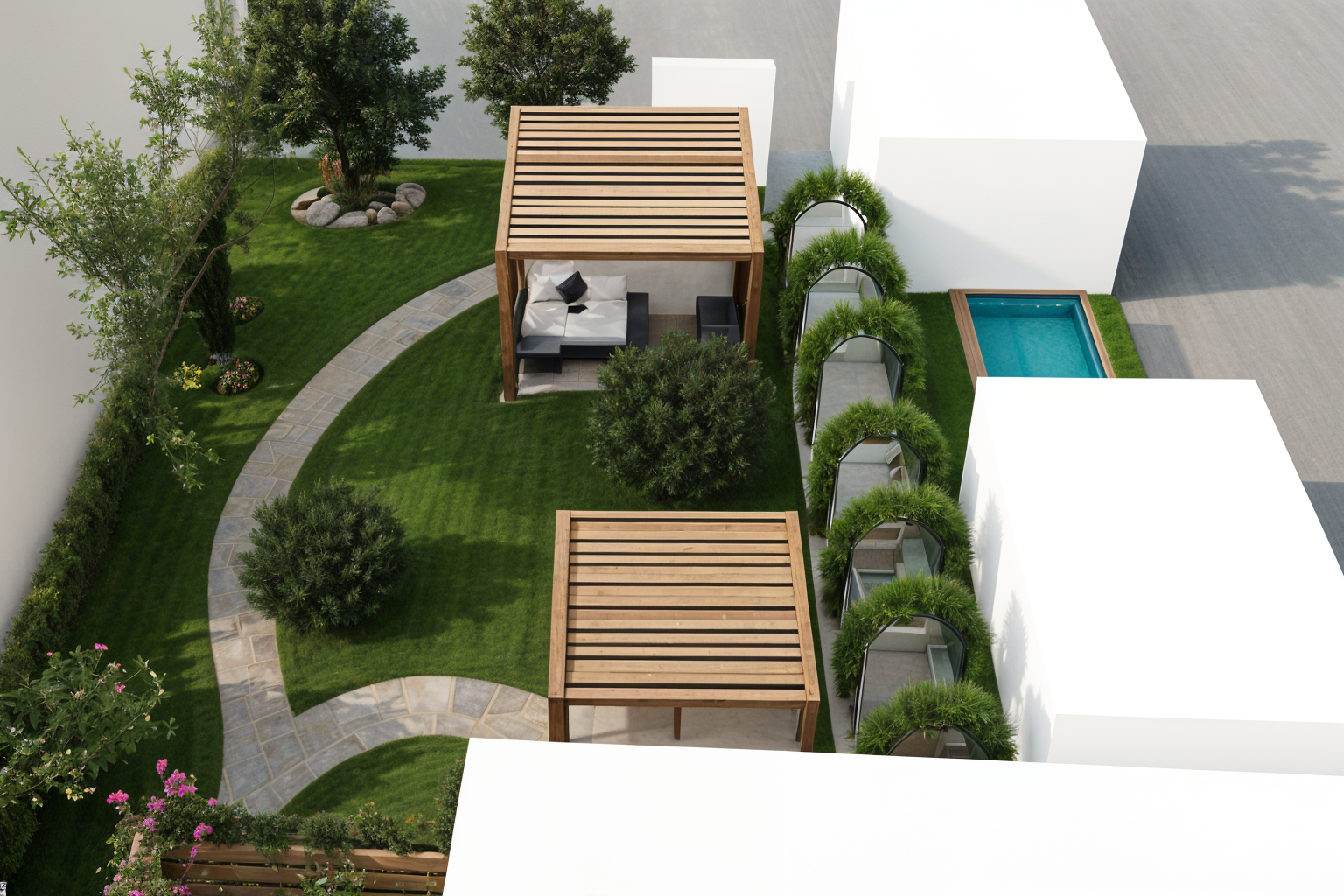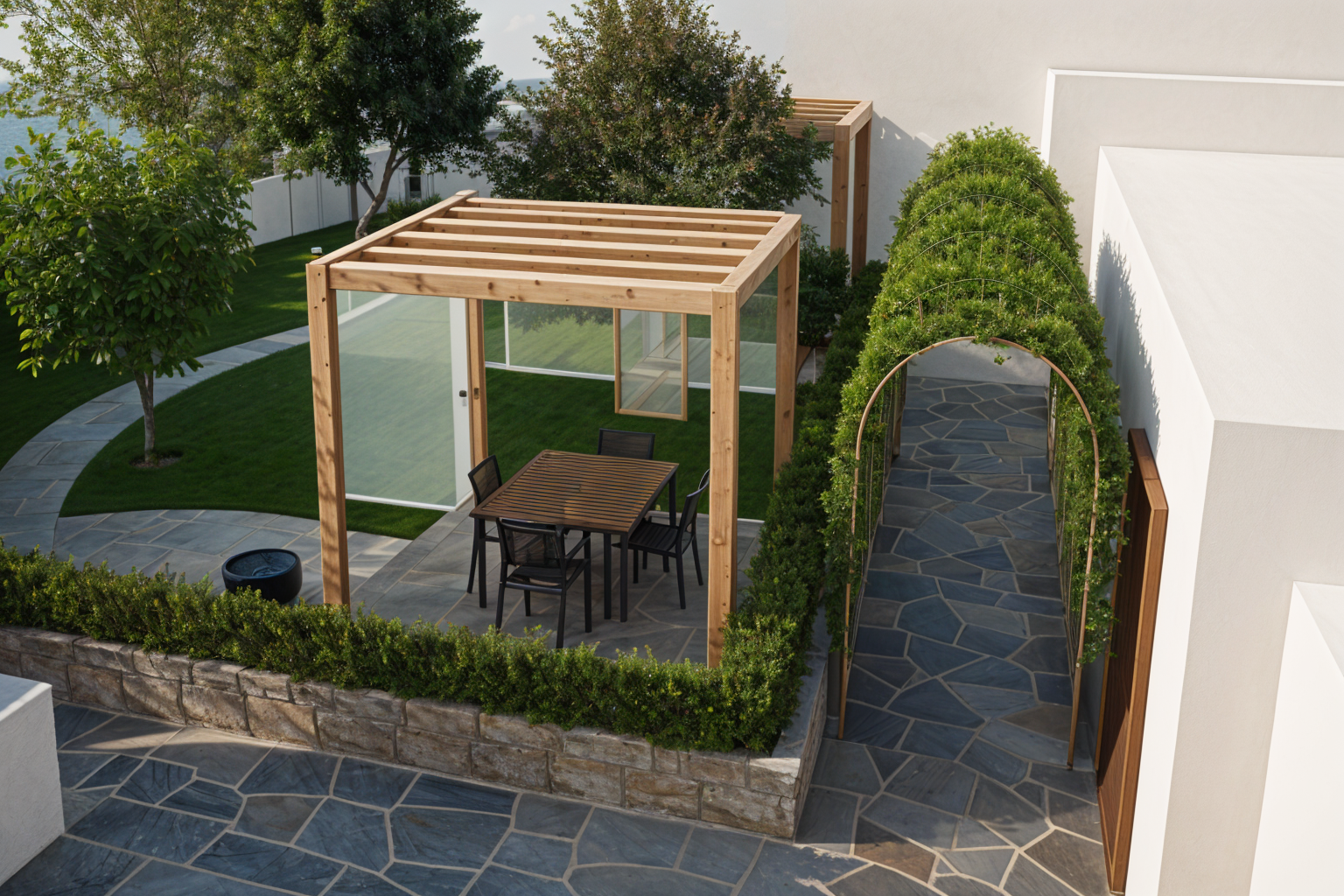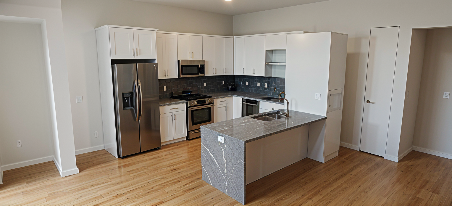 interior shot add hood material add countertop material add backsplash material also style with books a corner tree dishes a couple of vases and natural lighting make the stools natural in color make the glass doors bronze