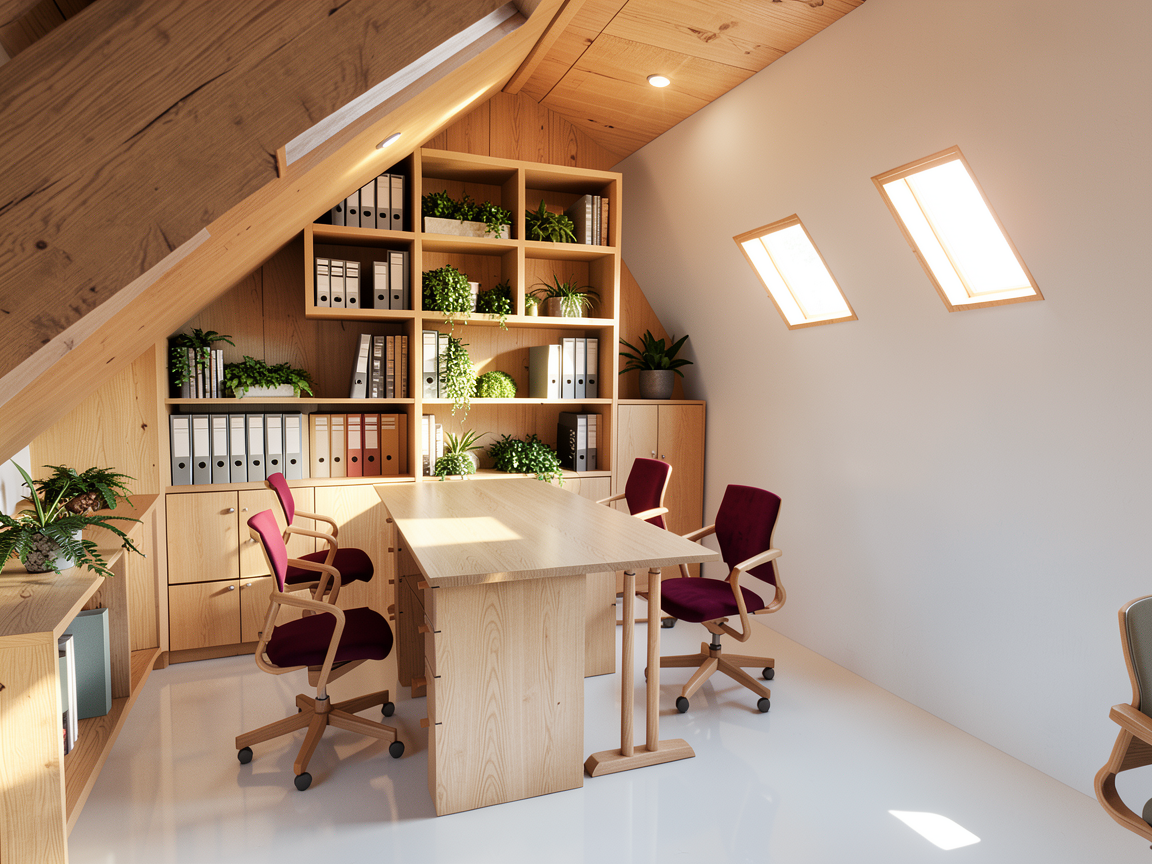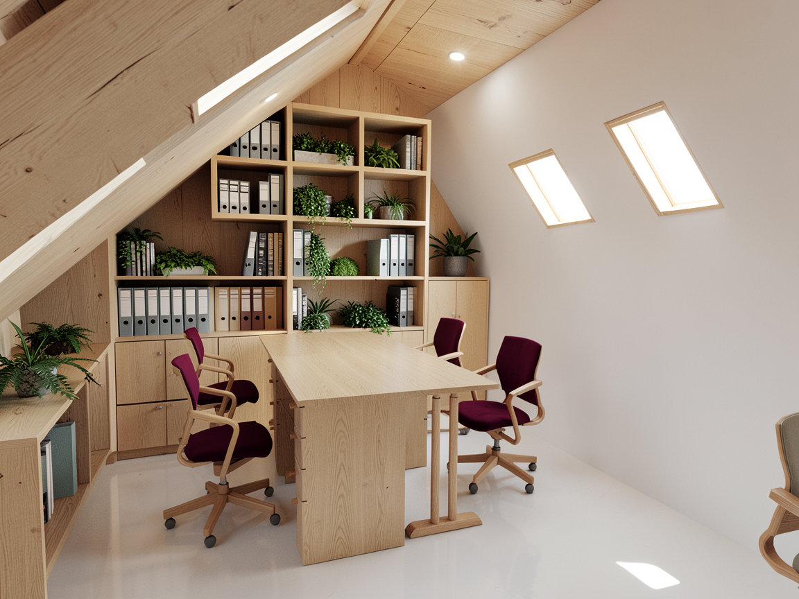 switch the sloped wall to the opposite side the left wall should stay vertical and white the right wall should now be the sloped wall and include the two small windows keep all other elements the same including shelves desks chairs and decor
