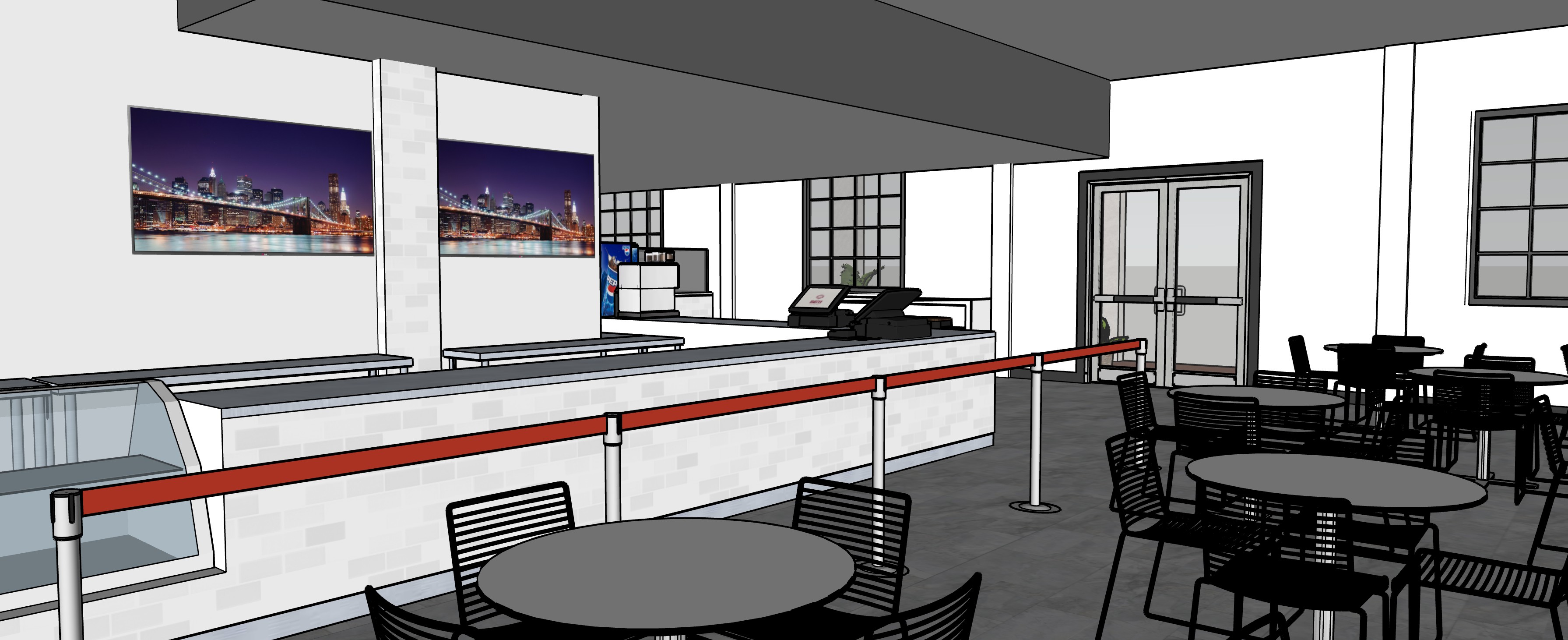 bagels and coffee cafe dropped soffit with dark grey paint dark grey trim and base