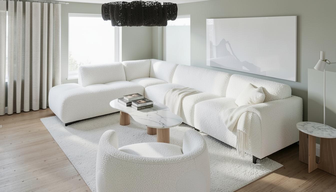 natural white boucle sofa and arm chair light beige wall color soft and light beige carpet table top is marble and table legs oak over all look is soft and natural beige colored
