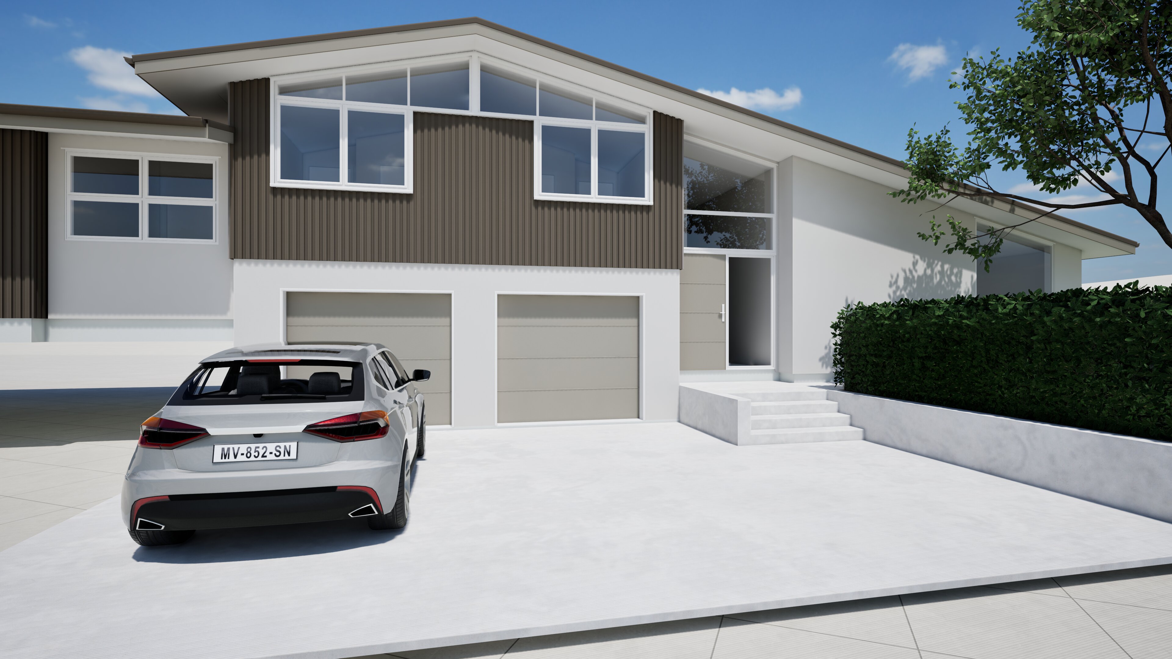 black cladding to house with white plaster features black window frames manicured lawns extensive native planting smooth concrete driveway and footpath background trees at sunset