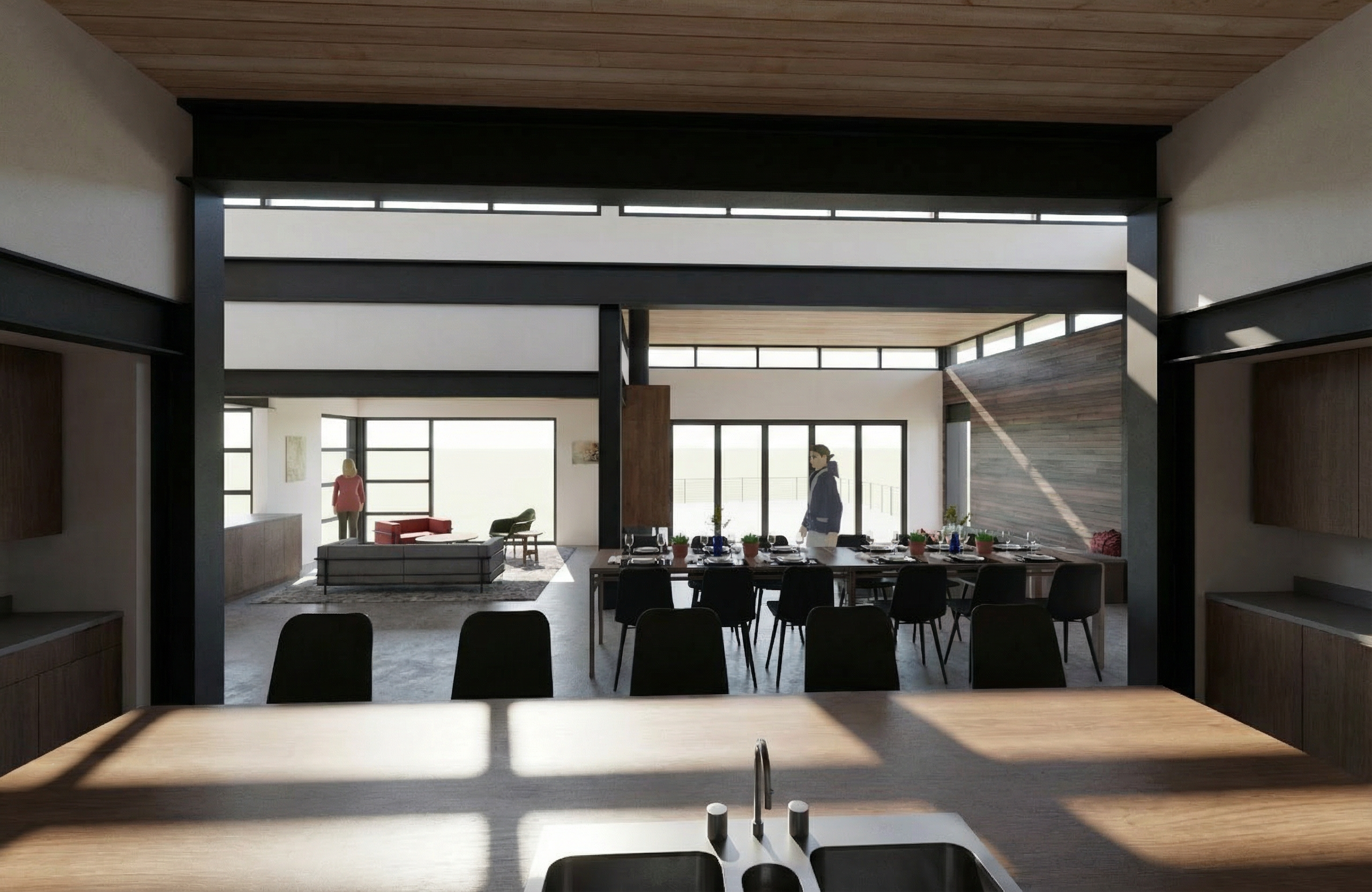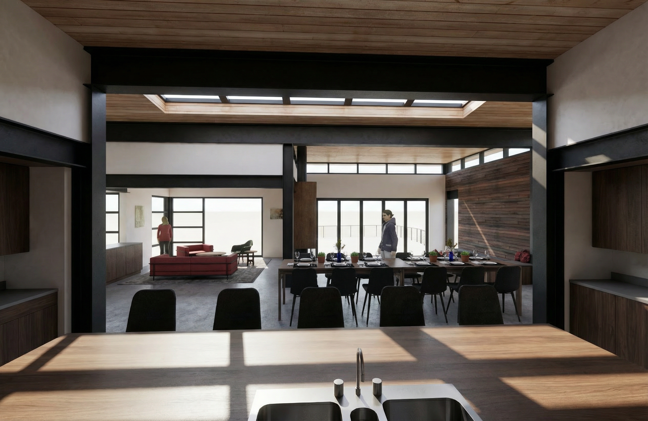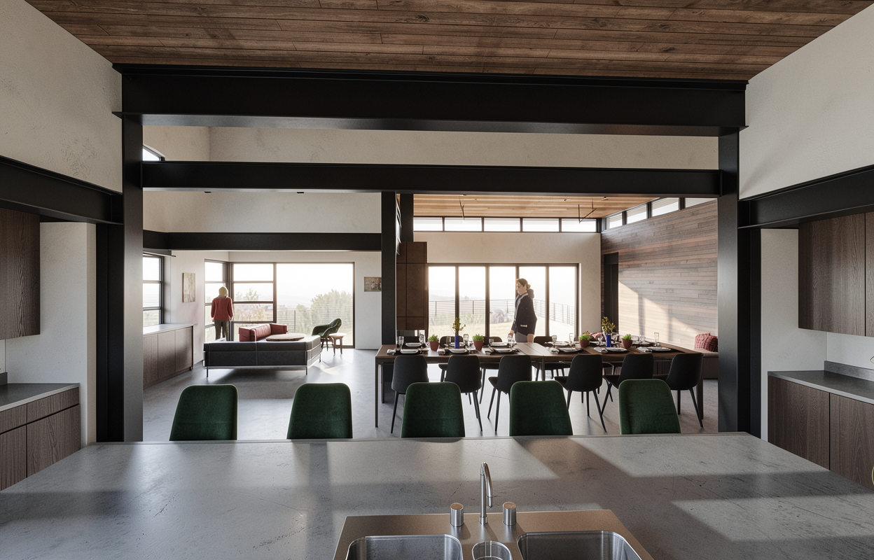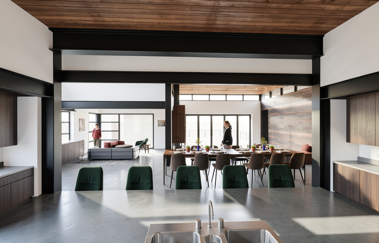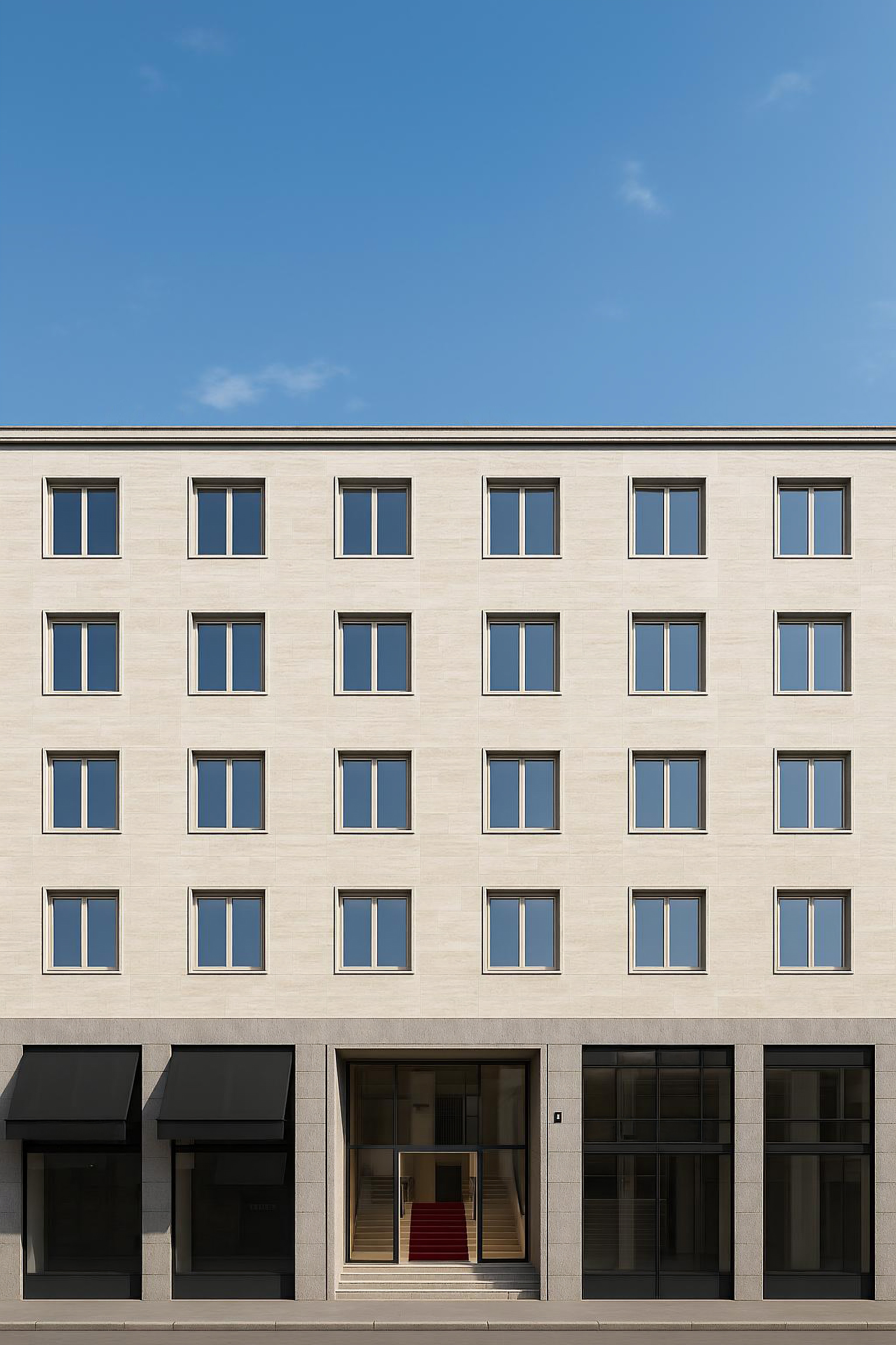 exterior shot create a scene like the reference image using the building details of the moodboard image