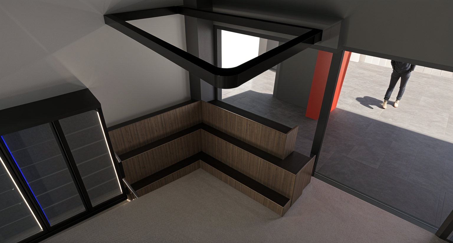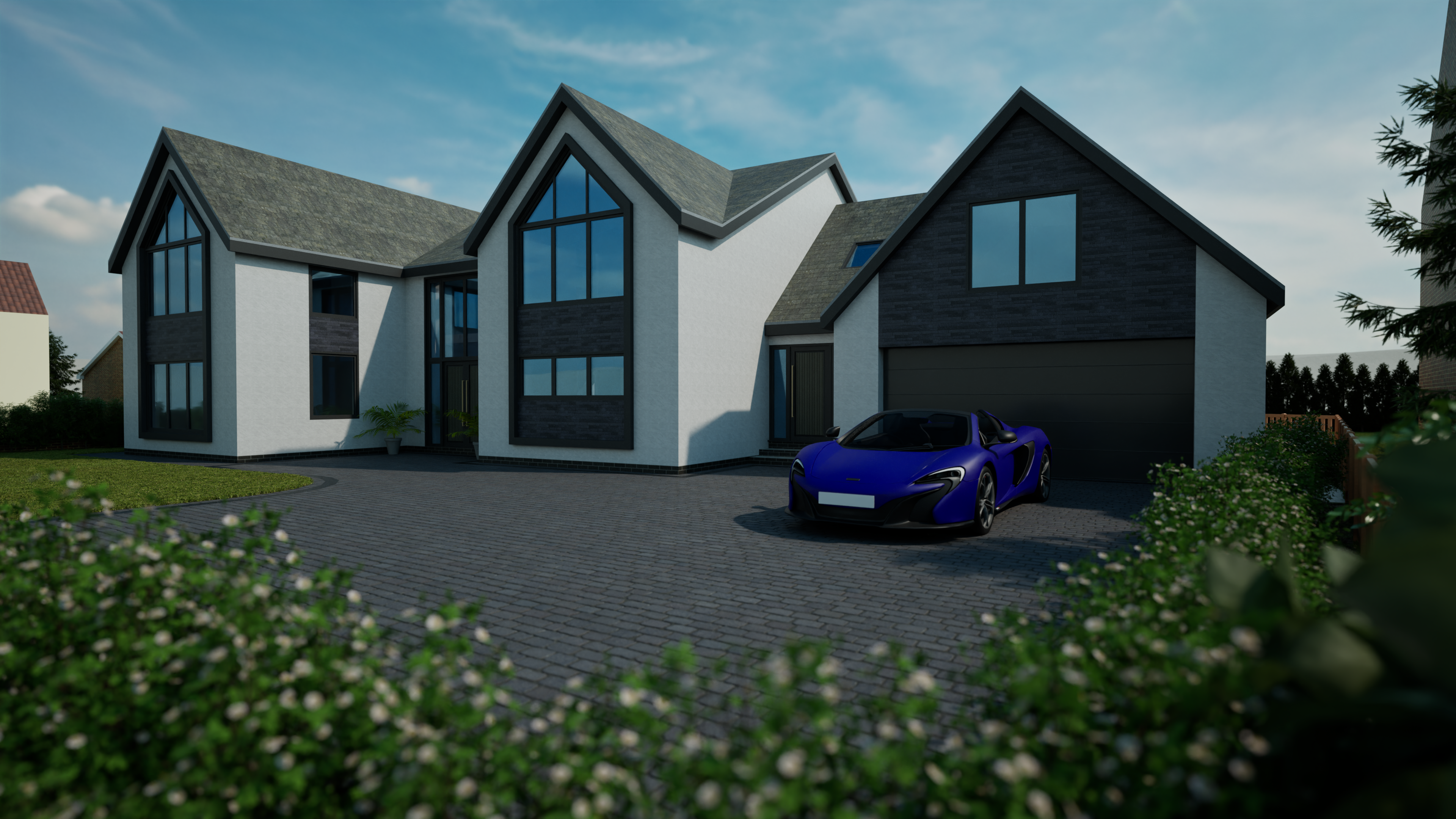 maintain design do not change any shapes or sizes do not change the car add external lights to either side of garage doors and feature windows central to wall add guttering to facsia s with vertical rain pipes to walls create realstic glass reflections with soft internal lights gentle warm summer glow realistic clouds and shadowing realstic landscaping