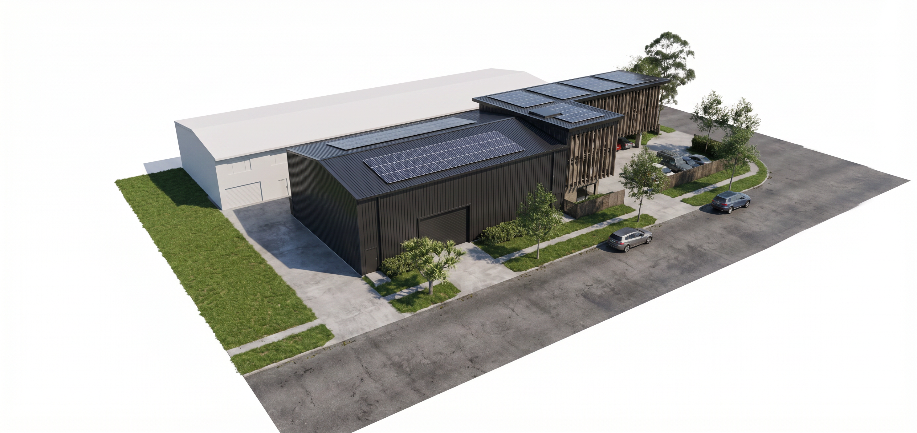modernist wide angle shot make it more craftsman and moden farmhouse also change the landscape to reflect maple and oak rees architecture