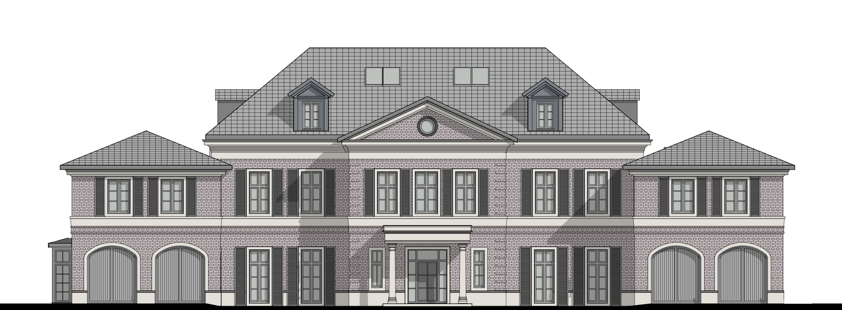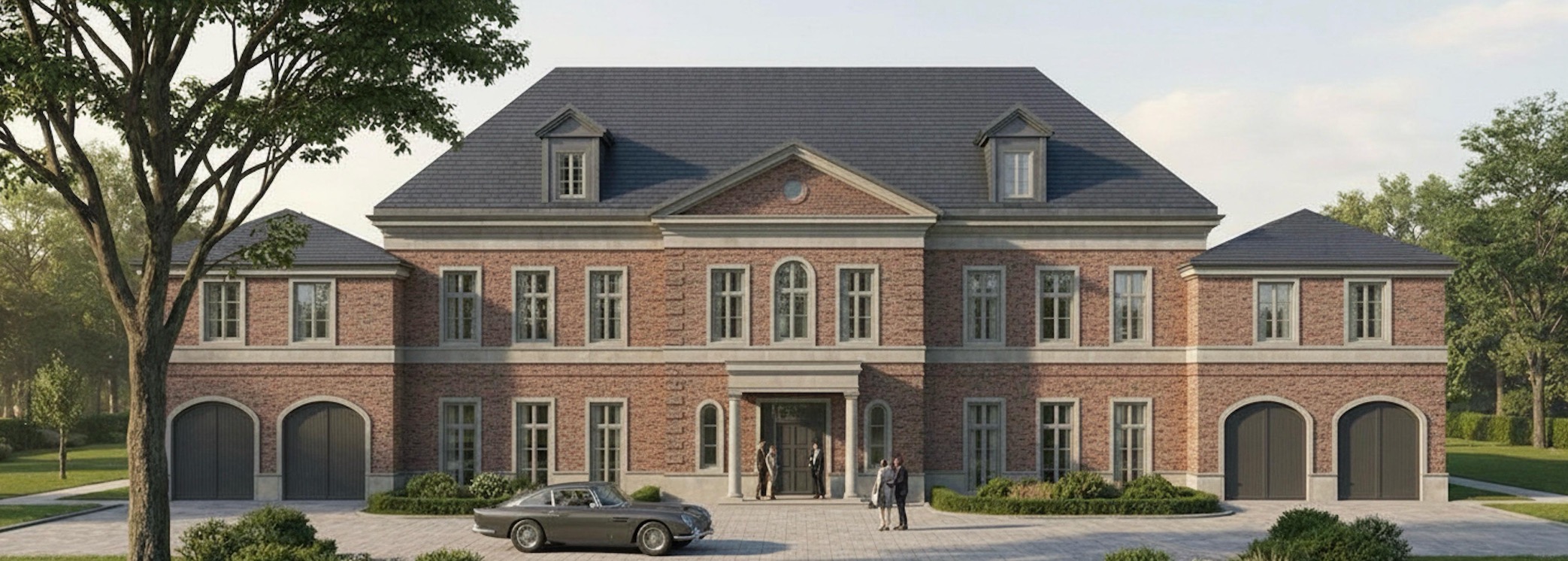 exterior shot visualisierung eines repr sentativen symmetrischen herrenhauses im klassischen stil zweigeschossig mit ausgebautem dachgeschoss hellrotem ziegelmauerwerk naturstein sockelzone und gesimsen in grau beige im erdgeschoss bodentiefe fenster alle proportionen ffnungen und bauteile fenster d cher tore umfassungen gesimse aus der skizze exakt beibehalten nur materialit t licht umgebung und detailtiefe realistisch ausarbeiten zentrale hauptfassade mit leicht vorspringendem mittelrisalit dreiecksgiebel klassischem portikus mit s ulen und repr sentativem haupteingang gleichm ige fensterachsen stehende fensterformate hellgraue holzfenster seitlich angeordnete geb udefl gel mit walmd chern integrierte garagentore in zur ckhaltender klassischer gestaltung dach geneigtes satteldach mit deckung mit flachen dachsteinen in dunklem anthrazit symmetrisch angeordnete gauben materialit t hellrotes klinkermauerwerk naturstein grau beige f r sockel fensterfaschen und gesimse hellgraue holzfenster garagentore und eingang dunkelgrau hochwertige handwerkliche anmutung vordergrund au enanlagen vor dem haupteingang eine zentrale hofsituation herrschaftlich angelegt im rechten und linkem bereich eine garagenzufahrt dezent in die gartenanlage integriert das grundst ck ist breiter als das geb ude keine hecken als grenze an das geb ude setzen sondern ca 8 m entfernt gro z gige klassische gartenanlage mit rasenfl chen b umen ein gro er alter laubbaum im vordergrund links oder mittig als raumbildendes element personen im bereich des hofes sowie ein auto umgebung parkartige landschaft mit alten b umen gepflegter rasen ruhige hochwertige atmosph re links und rechts vom geb ude keine begrenzung hecken dort garten mit b schen und rasen anlegen lichtstimmung weiches tageslicht leicht sonnig nat rliche farben realistische schatten kameraposition frontale perspektive auf augenh he leichte distanz vollst ndige fassadenansicht keine extreme weitwinkelverzerrung stil realistische architekturrendering visualisierung hochwertige wettbewerbsdarstellung keine menschen im vordergrund dominierend ruhige szenerie qualit t hohe detailtiefe realistische materialien fotorealistisch klare geometrie ruhige komposition